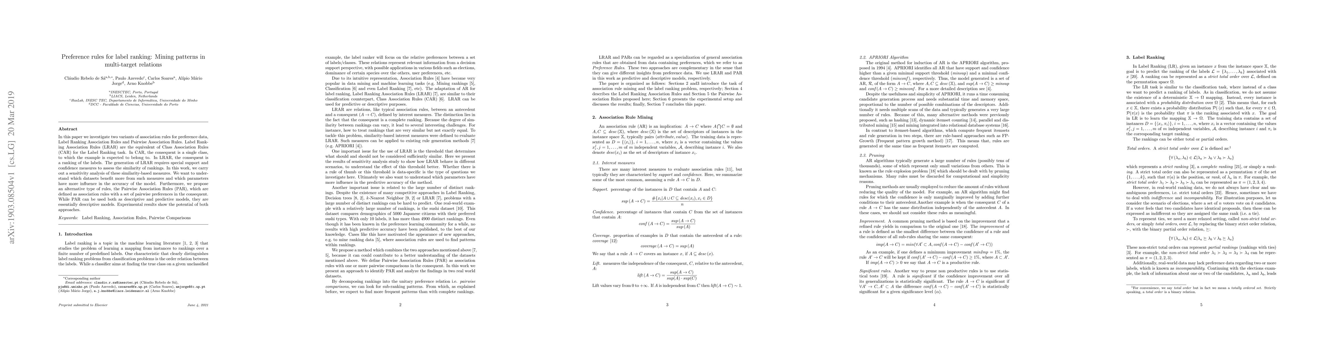 In this paper we investigate two variants of association rules for preference data, Label Ranking Association Rules and Pairwise Association Rules. Label Ranking Association Rules (LRAR) are the equivalent of Class Association Rules (CAR) for the Label Ranking task. In CAR, the consequent is a single class, to which the example is expected to belong to. In LRAR, the consequent is a ranking of the labels. The generation of LRAR requires special support and confidence measures to assess the similarity of rankings. In this work, we carry out a sensitivity analysis of these similarity-based measures. We want to understand which datasets benefit more from such measures and which parameters have more influence in the accuracy of the model. Furthermore, we propose an alternative type of rules, the Pairwise Association Rules (PAR), which are defined as association rules with a set of pairwise preferences in the consequent. While PAR can be used both as descriptive and predictive models, they are essentially descriptive models. Experimental results show the potential of both approaches.
