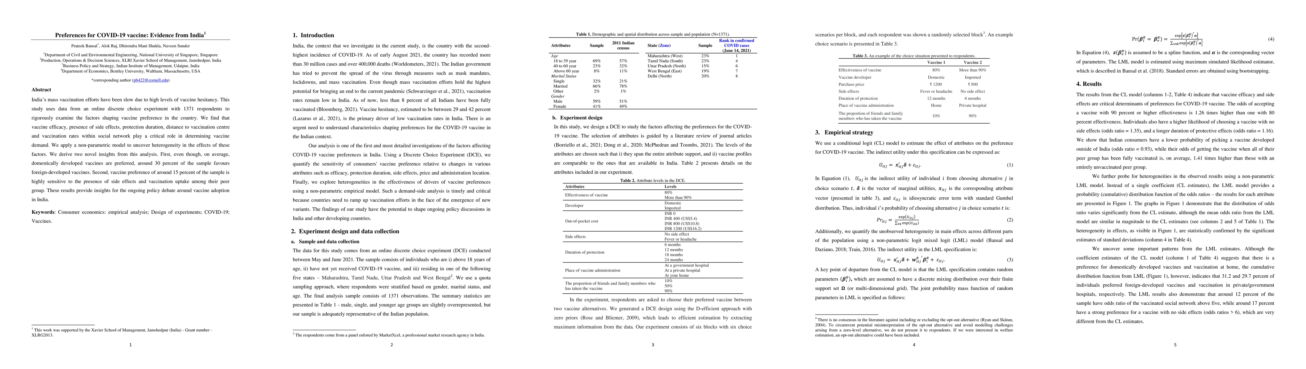 India's mass vaccination efforts have been slow due to high levels of vaccine hesitancy. This study uses data from an online discrete choice experiment with 1371 respondents to rigorously examine the factors shaping vaccine preference in the country. We find that vaccine efficacy, presence of side effects, protection duration, distance to vaccination centre and vaccination rates within social networks play a critical role in determining vaccine demand. We apply a non-parametric model to uncover the heterogeneity in the effects of these factors. We derive two novel insights from this analysis. First, even though, on average, domestically developed vaccines are preferred, around 30 percent of the sample favours foreign-developed vaccines. Second, the vaccine preference of around 15 percent of the sample is highly sensitive to the presence of side effects and vaccination uptake among their peer group. These results provide insights into the ongoing policy debate around vaccine adoption in India.