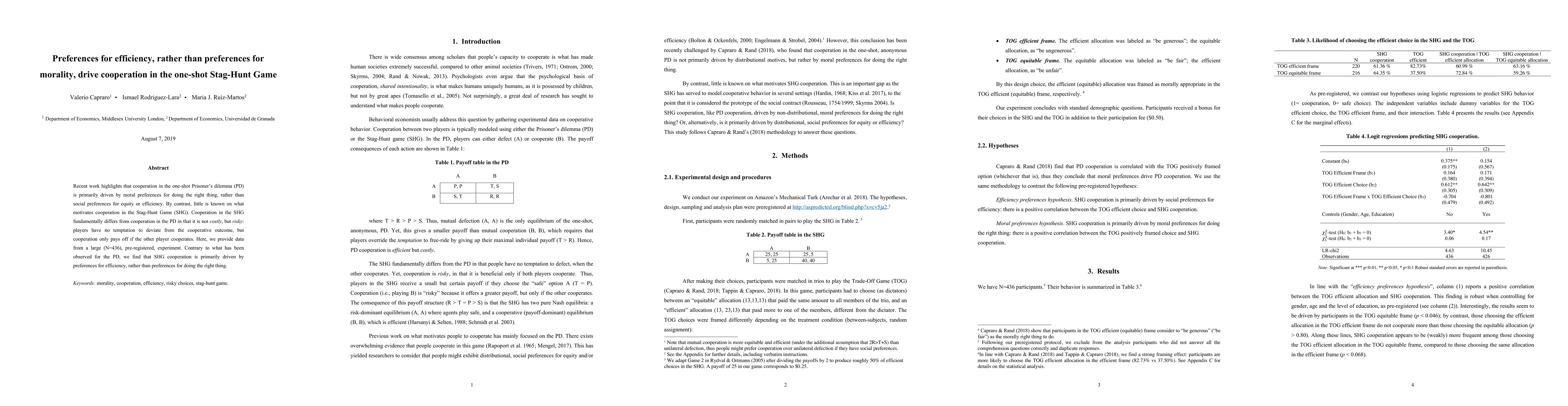 Unlike previous research focusing on moral preferences in the Prisoner's Dilemma, this study reveals that efficiency preferences are the primary drivers of cooperation in the Stag-Hunt Game, providing a fresh perspective on human cooperative behavior.