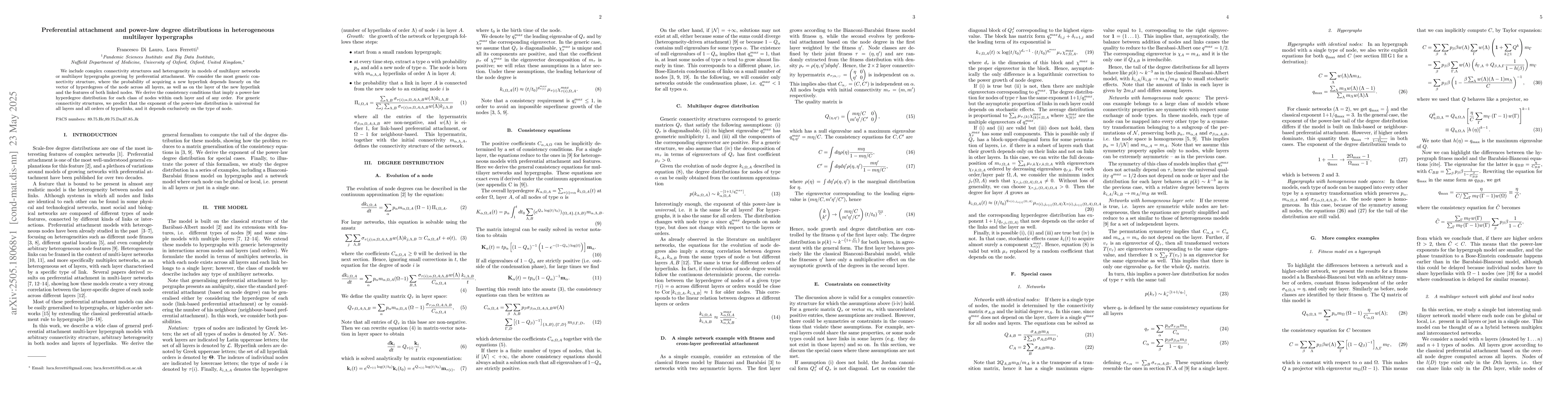 The paper presents a theoretical framework for predicting power-law degree distributions in heterogeneous multilayer hypergraphs under preferential attachment, providing consistency conditions and universality predictions.