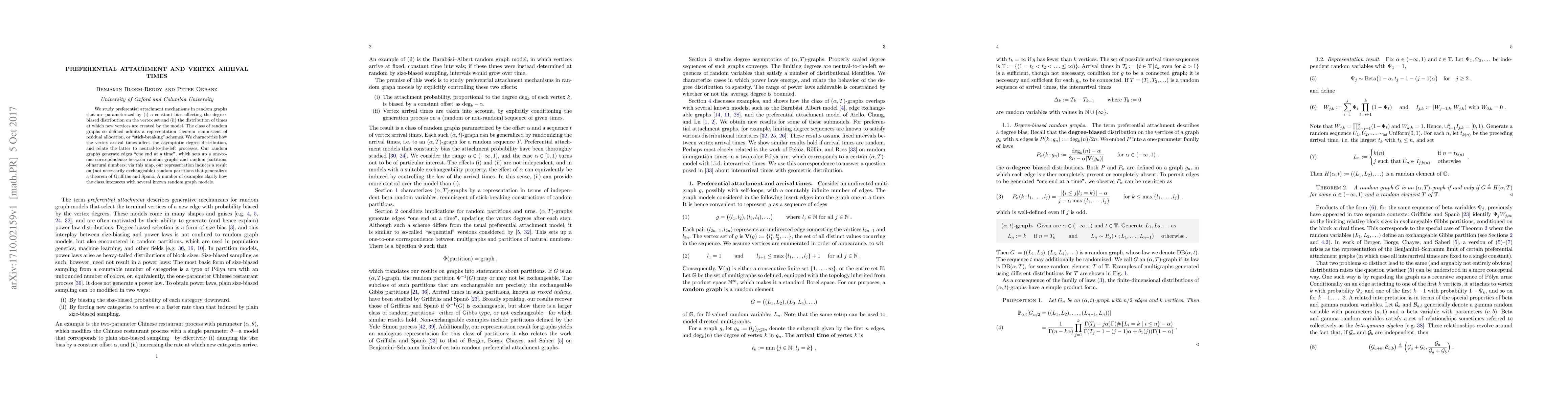 We study preferential attachment mechanisms in random graphs that are parameterized by (i) a constant bias affecting the degree-biased distribution on the vertex set and (ii) the distribution of times at which new vertices are created by the model. The class of random graphs so defined admits a representation theorem reminiscent of residual allocation, or "stick-breaking" schemes. We characterize how the vertex arrival times affect the asymptotic degree distribution, and relate the latter to neutral-to-the-left processes. Our random graphs generate edges "one end at a time", which sets up a one-to-one correspondence between random graphs and random partitions of natural numbers; via this map, our representation induces a result on (not necessarily exchangeable) random partitions that generalizes a theorem of Griffiths and Span\'o. A number of examples clarify how the class intersects with several known random graph models.