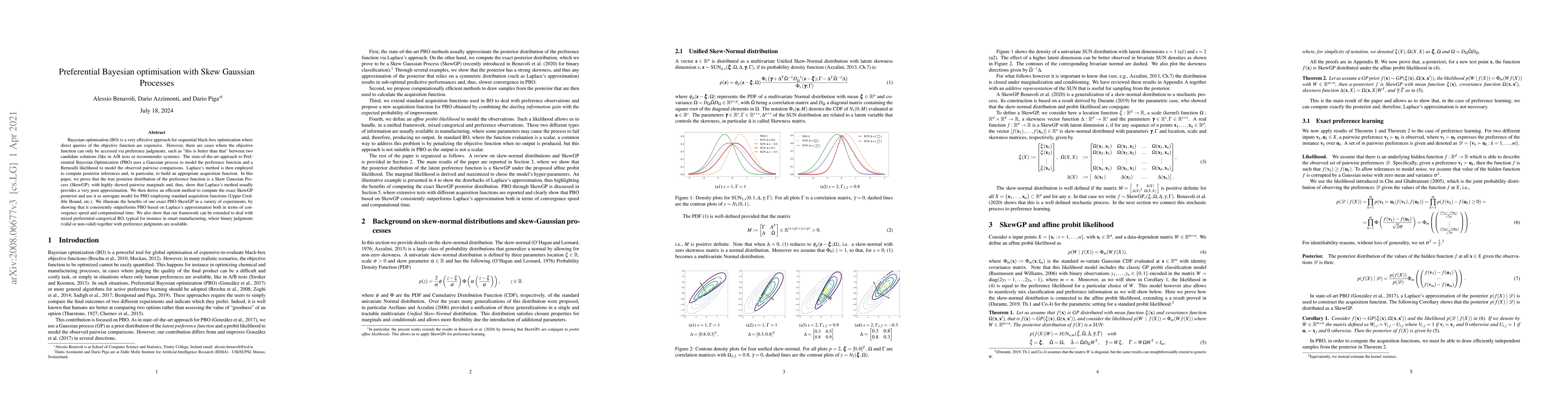 This paper proposes an exact Skew Gaussian Process (SkewGP) model for Preferential Bayesian optimisation (PBO) to improve preference function approximation over the traditional Gaussian process approach. It demonstrates that the exact SkewGP model significantly outperforms the Laplace's method approximation in terms of convergence speed and computational efficiency.