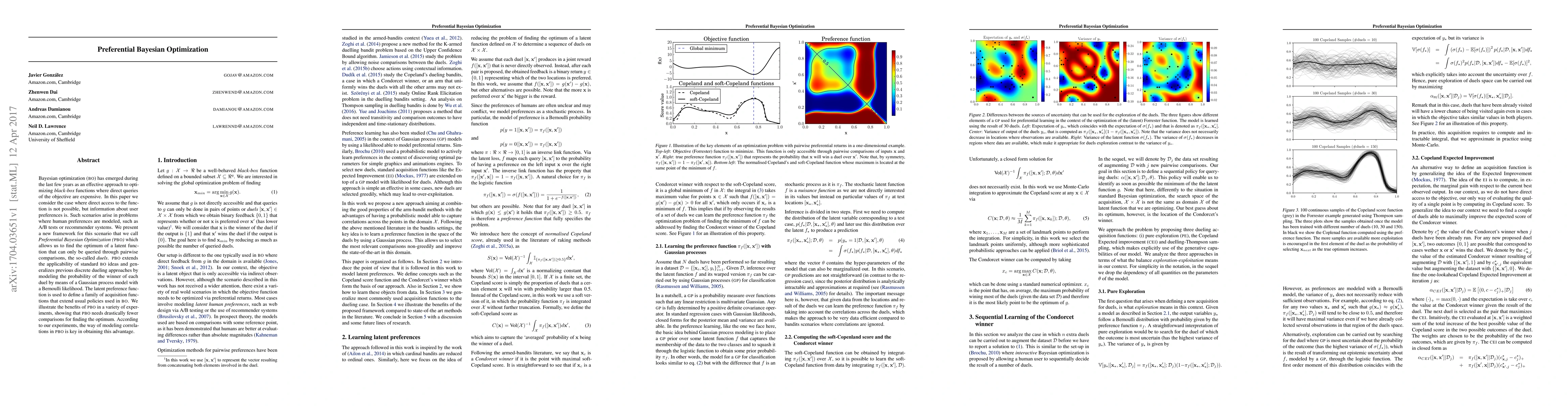 This paper introduces Preferential Bayesian Optimization (PBO), a novel framework for optimizing black-box functions through user preference information, modeled via pairwise comparisons. PBO leverages Gaussian processes to model duel outcomes and defines acquisition functions that significantly reduce the number of comparisons needed to find the optimal solution.