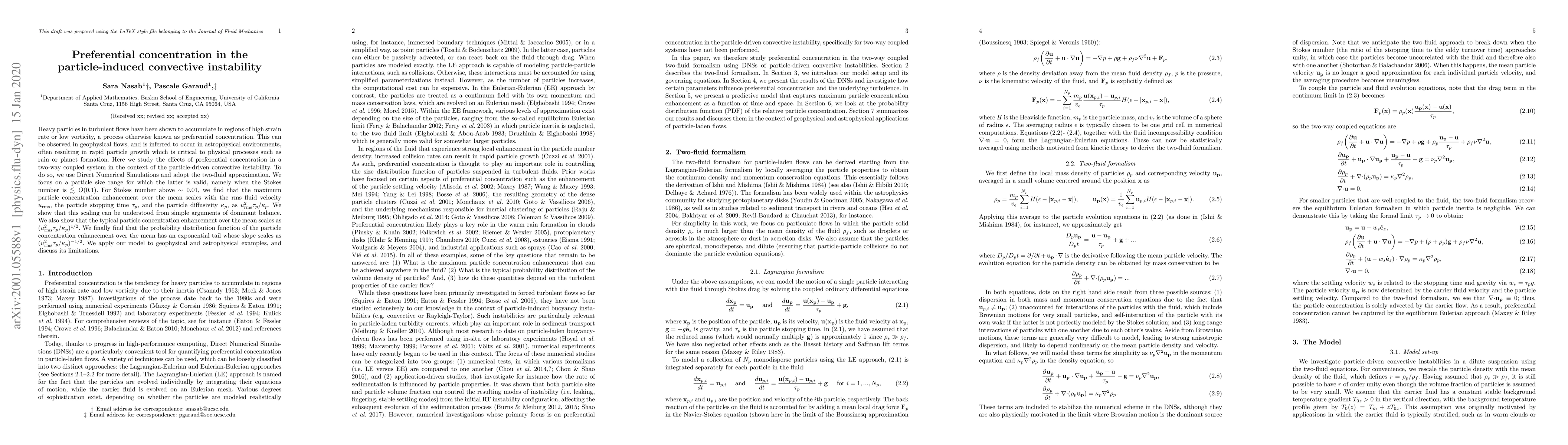 Heavy particles in turbulent flows have been shown to accumulate in regions of high strain rate or low vorticity, a process otherwise known as preferential concentration. This can be observed in geophysical flows, and is inferred to occur in astrophysical environments, often resulting in rapid particle growth which is critical to physical processes such as rain or planet formation. Here we study the effects of preferential concentration in a two-way coupled system in the context of the particle-driven convective instability. To do so, we use Direct Numerical Simulations and adopt the two-fluid approximation. We focus on a particle size range for which the latter is valid, namely when the Stokes number is $\lesssim O(0.1)$. For Stokes number above $\sim 0.01$, we find that the maximum particle concentration enhancement over the mean scales with the rms fluid velocity $u_{\rm{rms}}$, the particle stopping time $\tau_p$, and the particle diffusivity $\kappa_p$, as $u_{\rm{rms}}^2 \tau_p / \kappa_p$. We show that this scaling can be understood from simple arguments of dominant balance. We also show that the typical particle concentration enhancement over the mean scales as $(u_{\rm{rms}}^2 \tau_p/ \kappa_p)^{1/2}$. We finally find that the probability distribution function of the particle concentration enhancement over the mean has an exponential tail whose slope scales as $(u_{\rm{rms}}^2 \tau_p / \kappa_p)^{-1/2}$. We apply our model to geophysical and astrophysical examples, and discuss its limitations.