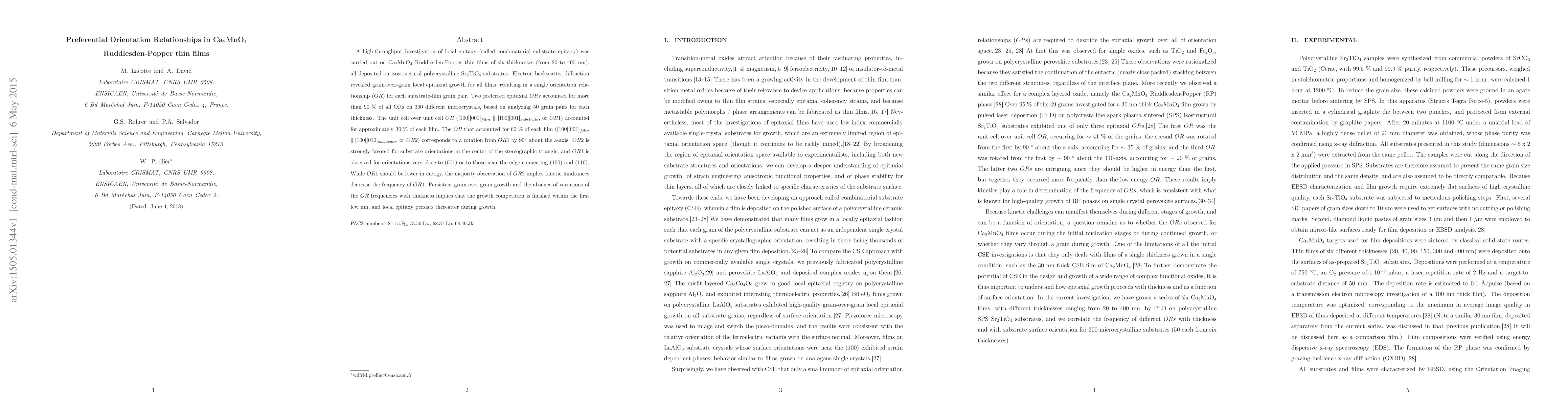 A high-throughput investigation of local epitaxy (called combinatorial substrate epitaxy) was carried out on Ca$_2$MnO$_4$ Ruddlesden-Popper thin films of six thicknesses (from 20 to 400 nm), all deposited on isostructural polycrystalline Sr$_2$TiO$_4$ substrates. Electron backscatter diffraction revealed grain-over-grain local epitaxial growth for all films, resulting in a single orientation relationship ($OR$) for each substrate-film grain pair. Two preferred epitaxial $ORs$ accounted for more than 90 \% of all ORs on 300 different microcrystals, based on analyzing 50 grain pairs for each thickness. The unit cell over unit cell $OR$ ([100][001]$_{film}$ $\parallel$ [100][001]$_{substrate}$, or $OR1$) accounted for approximately 30 \% of each film. The $OR$ that accounted for 60 \% of each film ([100][001]$_{film}$ $\parallel$ [100][010]$_{substrate}$, or $OR2$) corresponds to a rotation from $OR1$ by 90$^{\circ}$ about the a-axis. $OR2$ is strongly favored for substrate orientations in the center of the stereographic triangle, and $OR1$ is observed for orientations very close to (001) or to those near the edge connecting (100) and (110). While $OR1$ should be lower in energy, the majority observation of $OR2$ implies kinetic hindrances decrease the frequency of $OR1$. Persistent grain over grain growth and the absence of variations of the $OR$ frequencies with thickness implies that the growth competition is finished within the first few \si{\nano\meter}, and local epitaxy persists thereafter during growth.