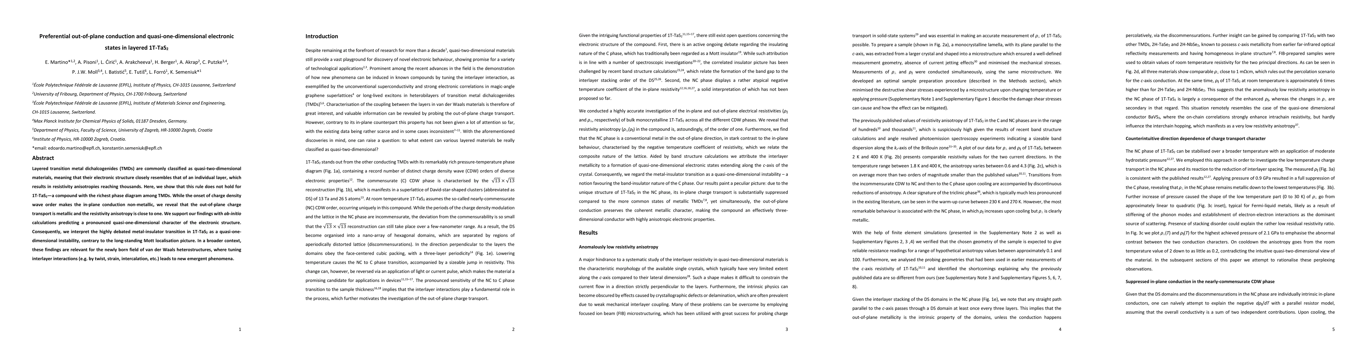This paper demonstrates that 1T-TaS2, a layered transition metal dichalcogenide, exhibits metallic out-of-plane charge transport despite non-metallic in-plane conduction, challenging the quasi-two-dimensional electronic structure assumption. The findings suggest a quasi-one-dimensional instability driving its metal-insulator transition, with implications for van der Waals heterostructures.