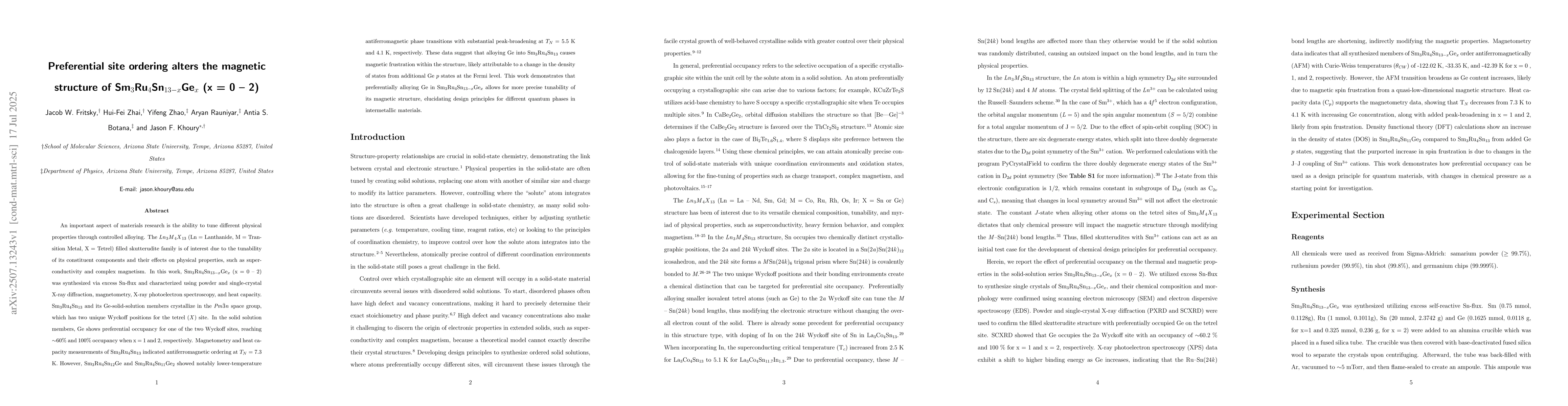 An important aspect of materials research is the ability to tune different physical properties through controlled alloying. The Ln$_3$M$_4$X$_{13}$ (Ln = Lanthanide, M = Transition Metal, X = Tetrel) filled skutterudite family is of interest due to the tunability of its constituent components and their effects on physical properties, such as superconductivity and complex magnetism. In this work, Sm$_3$Ru$_4$Sn$_{13-x}$Ge$_x$ (x = 0 -- 2) was synthesized via excess Sn-flux and characterized using powder and single-crystal X-ray diffraction, magnetometry, X-ray photoelectron spectroscopy, and heat capacity. Sm$_3$Ru$_4$Sn$_{13}$ and its Ge-solid-solution members crystallize in the Pm-3n space group, which has two unique Wyckoff positions for the tetrel (X) site. In the solid solution members, Ge shows preferential occupancy for one of the two Wyckoff sites, reaching $\sim$60$\%$ and 100$\%$ occupancy when x = 1 and 2, respectively. Magnetometry and heat capacity measurements of Sm$_3$Ru$_4$Sn$_{13}$ indicated antiferromagnetic ordering at $T_N$ = 7.3 K. However, Sm$_3$Ru$_4$Sn$_{12}$Ge and Sm$_3$Ru$_4$Sn$_{11}$Ge$_2$ showed notably lower-temperature antiferromagnetic phase transitions with substantial peak-broadening at $T_N$ = 5.5 K and 4.1 K, respectively. These data suggest that alloying Ge into Sm$_3$Ru$_4$Sn$_{13}$ causes magnetic frustration within the structure, likely attributable to a change in the density of states from additional Ge $p$ states at the Fermi level. This work demonstrates that preferentially alloying Ge in Sm$_3$Ru$_4$Sn$_{13-x}$Ge$_x$ allows for more precise tunability of its magnetic structure, elucidating design principles for different quantum phases in intermetallic materials.