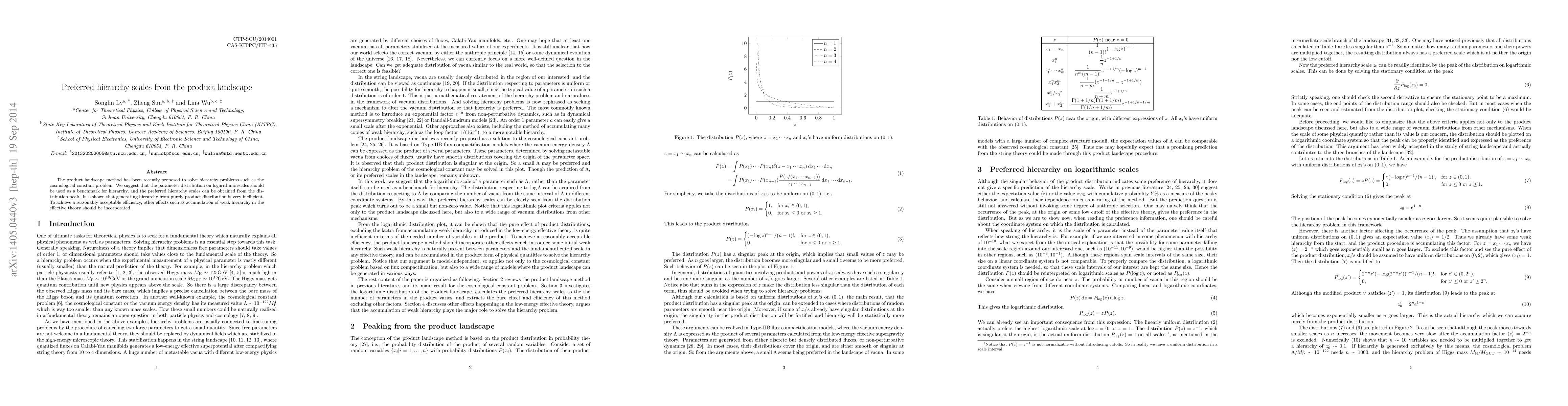 This paper proposes using the product landscape method to address hierarchy problems, suggesting that parameter distribution peaks on logarithmic scales indicate preferred hierarchy scales. It concludes that pure product distribution is inefficient for generating hierarchy and recommends incorporating additional effects like weak hierarchy accumulation for better efficiency.