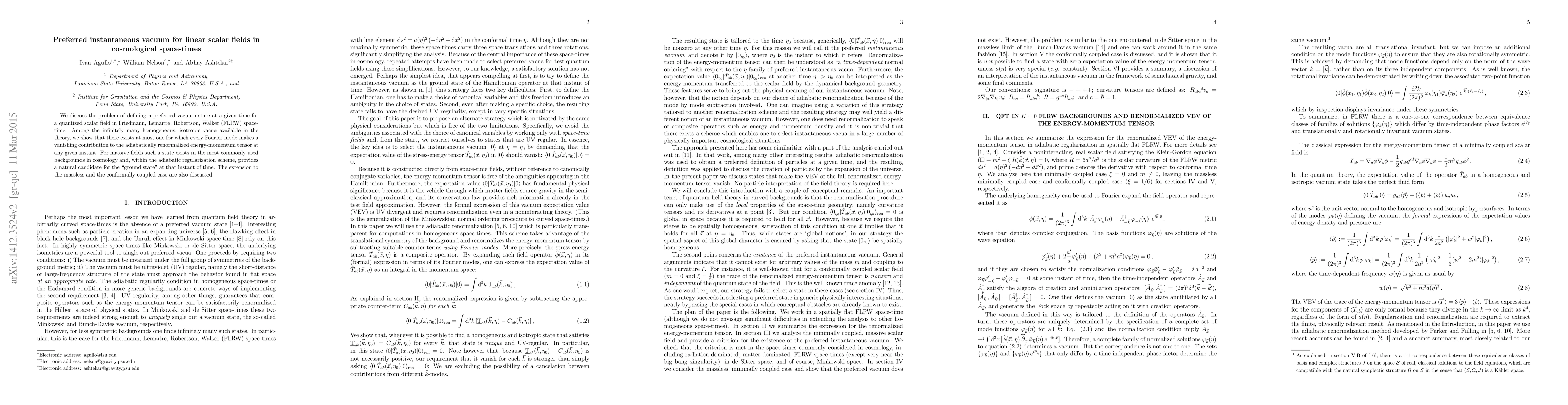 This paper explores the concept of a 'preferred' vacuum state for quantized scalar fields in cosmological Friedmann-Lemaître-Robertson-Walker (FLRW) space-times. It demonstrates that for massive fields, there's a unique vacuum contributing zero to the renormalized energy-momentum tensor at any given time, suggesting a natural ground state candidate. The discussion also extends to massless and conformally coupled fields.