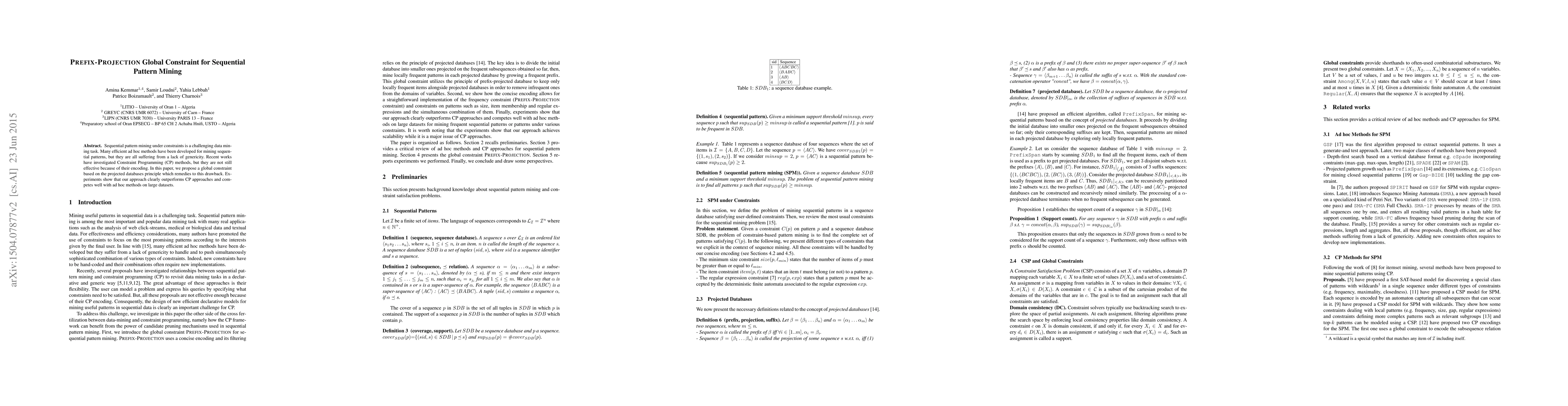 This paper introduces a new global constraint called Prefix-Projection for efficient sequential pattern mining under constraints, addressing the lack of genericity in existing ad hoc methods. Experimental results demonstrate superior performance over Constraint Programming approaches and competitive results against specialized methods on large datasets.