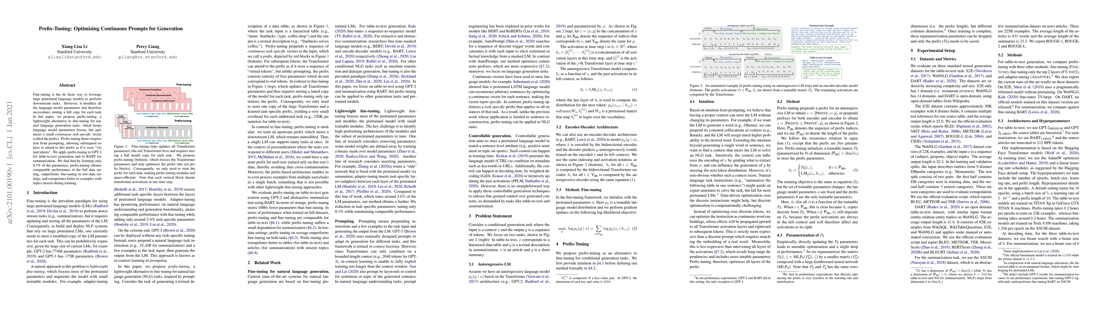 This paper introduces prefix-tuning, a lightweight alternative to fine-tuning large language models for generation tasks, which optimizes a small task-specific vector while keeping the model parameters frozen. Prefix-tuning achieves comparable or better performance than fine-tuning, especially in low-data settings and for unseen topics.