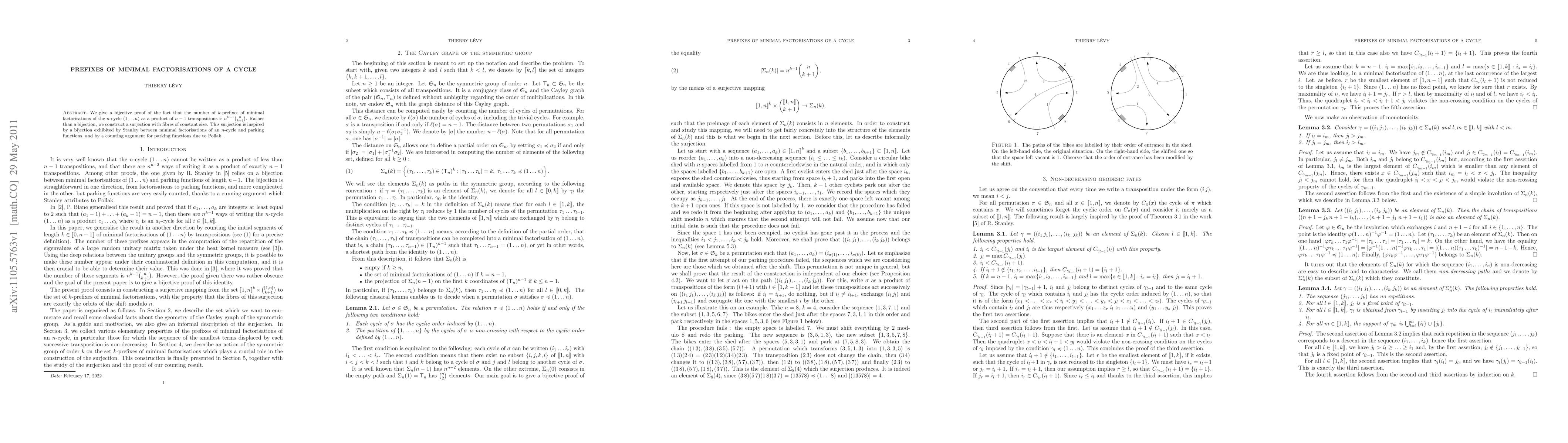 The paper provides a bijective proof that the number of k-prefixes of minimal factorisations of an n-cycle is n^{k-1}inom{n}{k+1}. It also presents a surjection with constant-sized fibers inspired by related bijections and counting arguments.