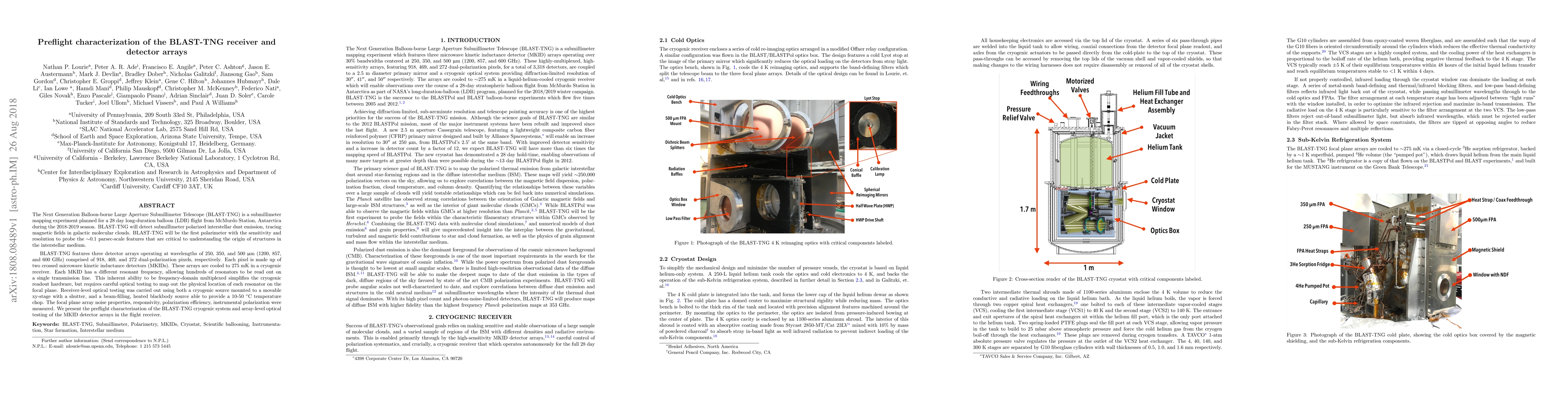 This paper details the preflight characterization of the BLAST-TNG telescope's cryogenic receiver and detector arrays, which are designed to detect submillimeter polarized interstellar dust emission. The arrays, composed of microwave kinetic inductance detectors (MKIDs), are tested for noise properties, responsivity, and polarization efficiency to ensure optimal performance for mapping galactic molecular clouds.