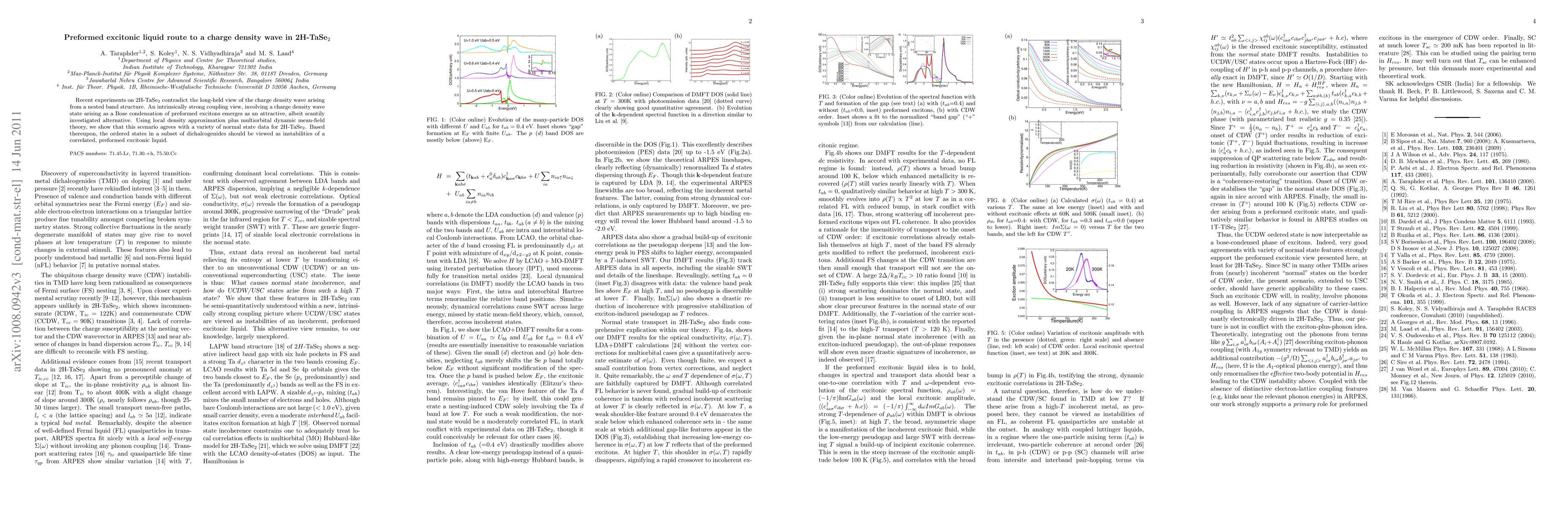 Recent experiments on 2H-TaSe$_2$ contradict the long-held view of the charge density wave arising from a nested band structure. An intrinsically strong coupling view, involving a charge density wave state arising as a Bose condensation of preformed excitons emerges as an attractive, albeit scantily investigated alternative. Using local density approximation plus multiorbital dynamic mean-field theory, we show that this scenario agrees with a variety of normal state data for 2H-TaSe$_{2}$. Based thereupon, the ordered states in a subset of dichalcogenides should be viewed as instabilities of a correlated, preformed excitonic liquid.
