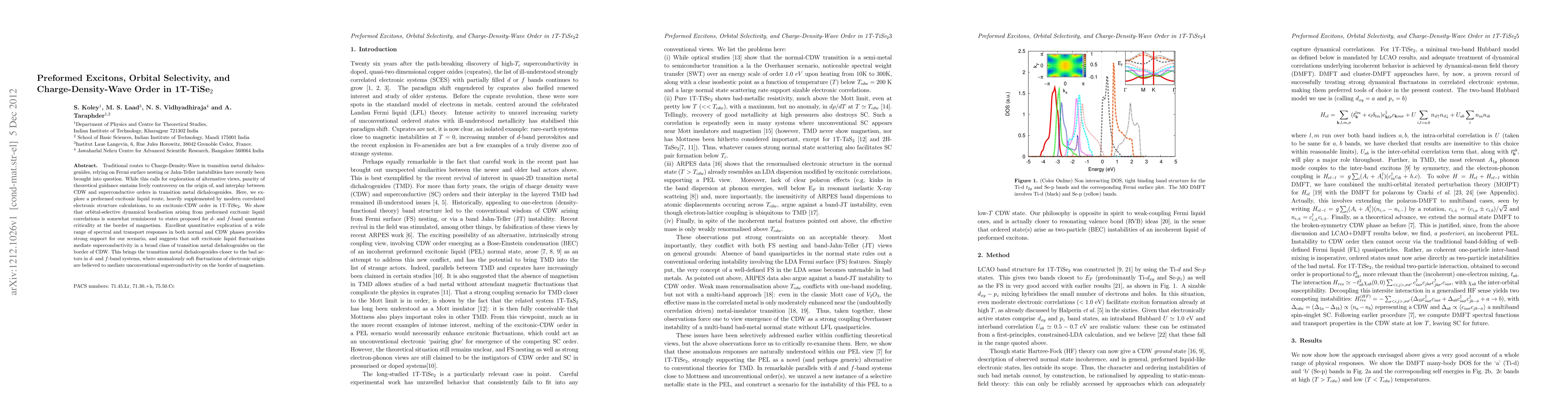 Traditional routes to Charge-Density-Wave in transition metal dichalcogenides, relying on Fermi surface nesting or Jahn-Teller instabilities have recently been brought into question. While this calls for exploration of alternative views, paucity of theoretical guidance sustains lively controversy on the origin of, and interplay between CDW and superconductive orders in transition metal dichalcogenides. Here, we explore a preformed excitonic liquid route, heavily supplemented by modern correlated electronic structure calculations, to an excitonic-CDW order in 1T-TiSe$_{2}$. We show that orbital-selective dynamical localisation arising from preformed excitonic liquid correlations is somewhat reminiscent to states proposed for $d$- and $f$-band quantum criticality at the border of magnetism. Excellent quantitative explication of a wide range of spectral and transport responses in both normal and CDW phases provides strong support for our scenario, and suggests that soft excitonic liquid fluctuations mediate superconductivity in a broad class of transition metal dichalcogenides on the border of CDW. This brings the transition metal dichalcogenides closer to the bad actors in $d$- and $f$-band systems, where anomalously soft fluctuations of electronic origin are believed to mediate unconventional superconductivity on the border of magnetism.