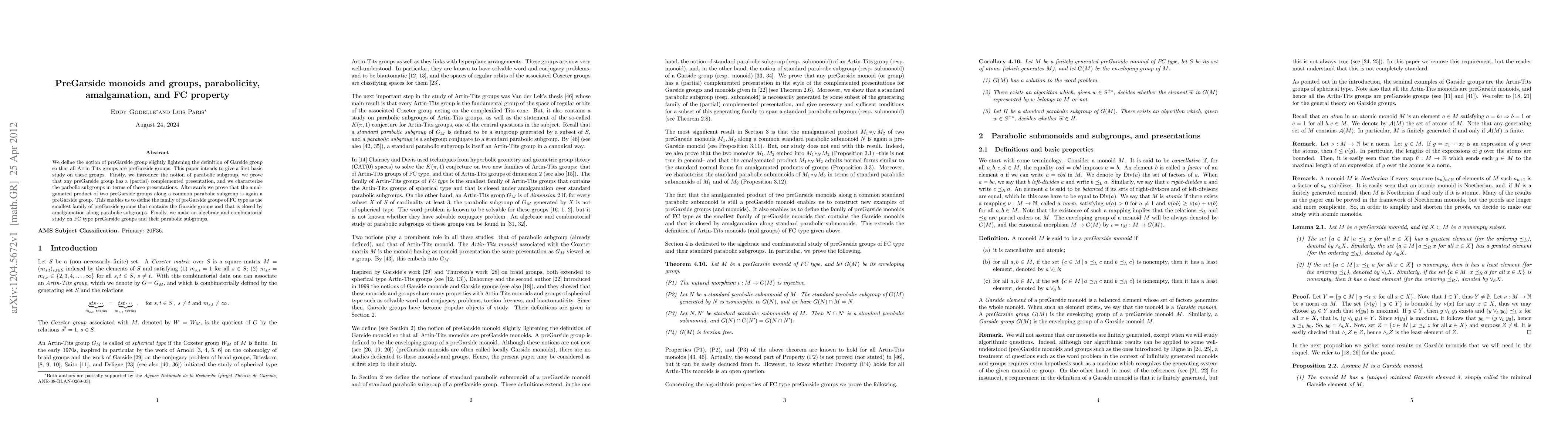 This paper introduces preGarside groups, a generalized version of Garside groups that includes all Artin-Tits groups, and studies their properties, including parabolic subgroups, presentations, and amalgamation. It also defines preGarside groups of FC type and examines their algebraic and combinatorial characteristics.