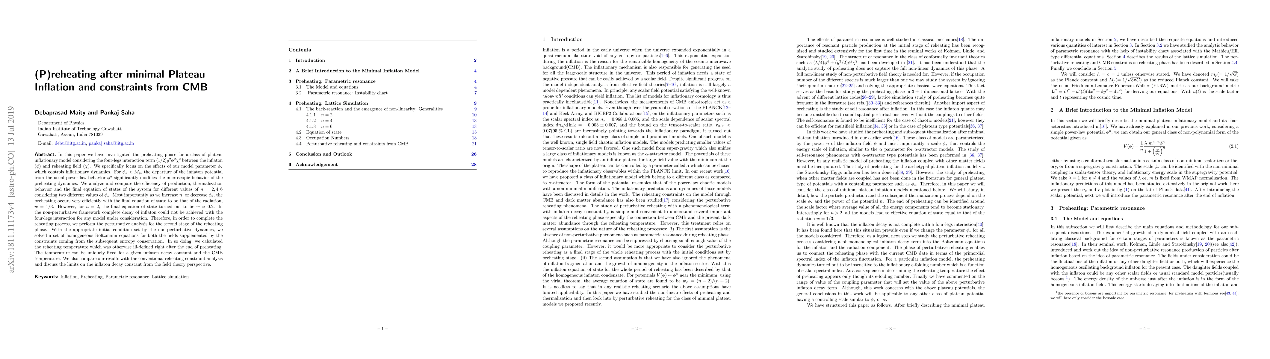 This paper investigates the preheating dynamics following minimal plateau inflation, focusing on a four-leg interaction term between the inflaton and reheating fields. It finds that efficient preheating and a radiation-dominated final state occur for higher values of n and lower values of the parameter φ*. The study also performs a perturbative analysis to complete the reheating process and determines the reheating temperature, comparing it with conventional constraints and discussing the limits of the inflaton decay constant.