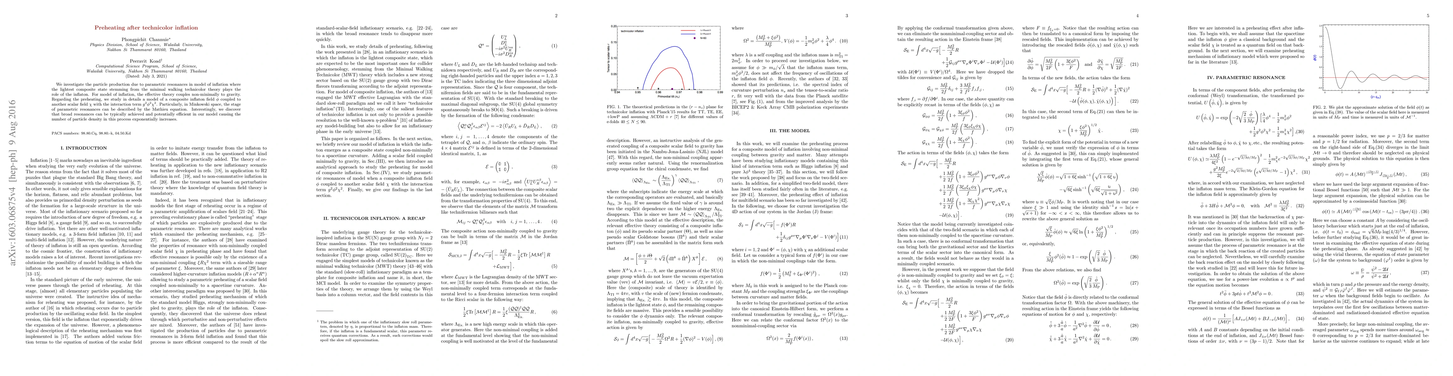 We investigate the particle production due to parametric resonances in model of inflation where the lightest composite state stemming from the minimal walking technicolor theory plays the role of the inflaton. For model of inflation, the effective theory couples non-minimally to gravity. Regarding the preheating, we study in details a model of a composite inflaton field $\phi$ coupled to another scalar field $\chi$ with the interaction term $g^{2}\phi^{2}\chi^{2}$. Particularly, in the Minkowski space, the stage of parametric resonances can be described by the Mathieu equation. Interestingly, we discover that broad resonances can be typically achieved and potentially efficient in our model causing the number of particle density in this process exponentially increases.