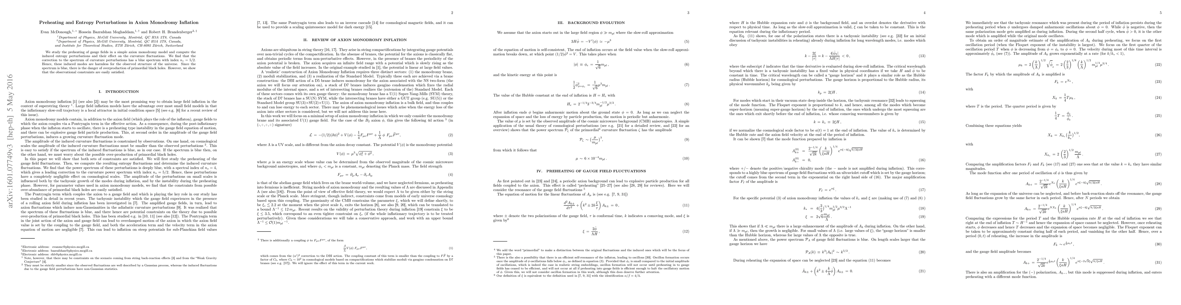 We study the preheating of gauge fields in a simple axion monodromy model and compute the induced entropy perturbations and their effect on the curvature fluctuations. We find that the correction to the spectrum of curvature perturbations has a blue spectrum with index $n_s = 5/2$. Hence, these induced modes are harmless for the observed structure of the universe. Since the spectrum is blue, there is the danger of overproduction of primordial black holes. However, we show that the observational constraints are easily satisfied.
