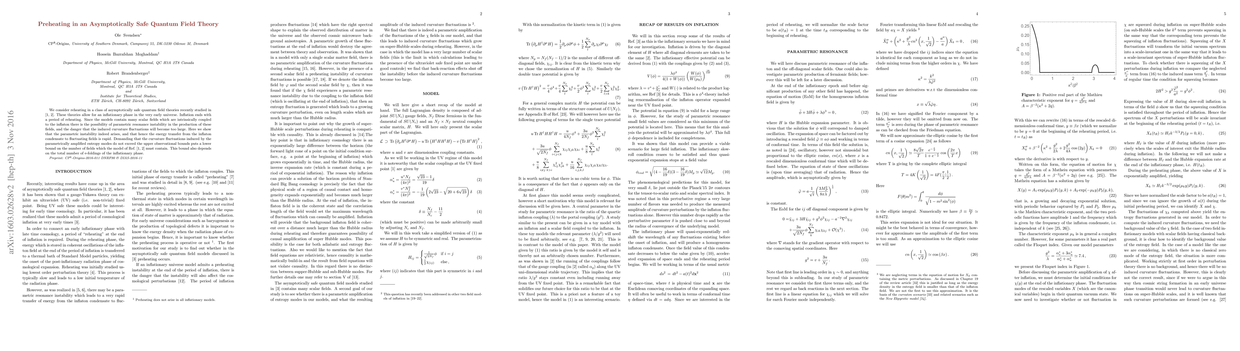 We consider reheating in a class of asymptotically safe quantum field theories recently studied in \cite{Litim:2014uca, Litim:2015iea}. These theories allow for an inflationary phase in the very early universe. Inflation ends with a period of reheating. Since the models contain many scalar fields which are intrinsically coupled to the inflaton there is the possibility of parametric resonance instability in the production of these fields, and the danger that the induced curvature fluctuations will become too large. Here we show that the parametric instability indeed arises, and that hence the energy transfer from the inflaton condensate to fluctuating fields is rapid. Demanding that the curvature fluctuations induced by the parametrically amplified entropy modes do not exceed the upper observational bounds puts a lower bound on the number of fields which the model of Ref.~\cite{Litim:2014uca, Litim:2015iea} must contain. This bound also depends on the total number of e-foldings of the inflationary phase.