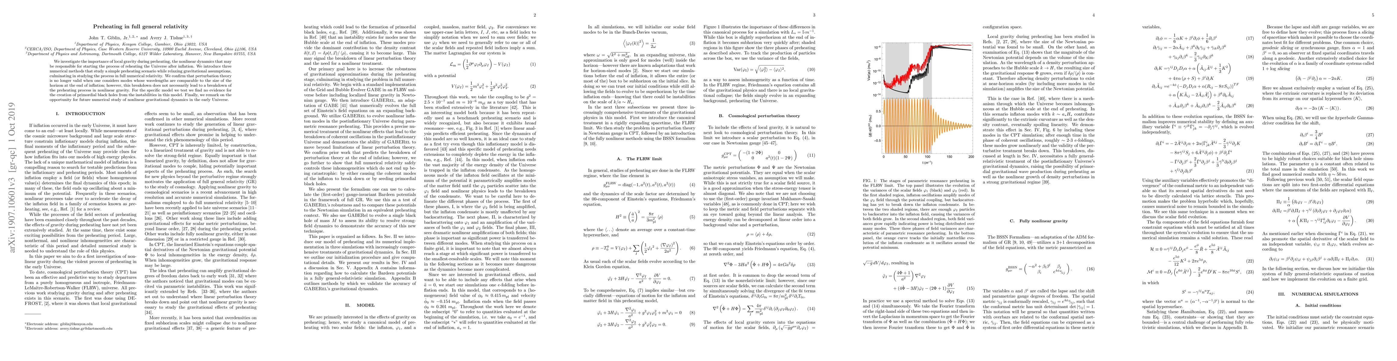 This paper explores the role of local gravity in preheating, a phase following inflation that initiates reheating of the universe. It employs three numerical methods to study preheating dynamics in full general relativity, finding that perturbation theory fails for wavelengths comparable to the horizon size but does not disrupt the preheating process. The study finds no evidence of primordial black holes from instabilities in the tested model.