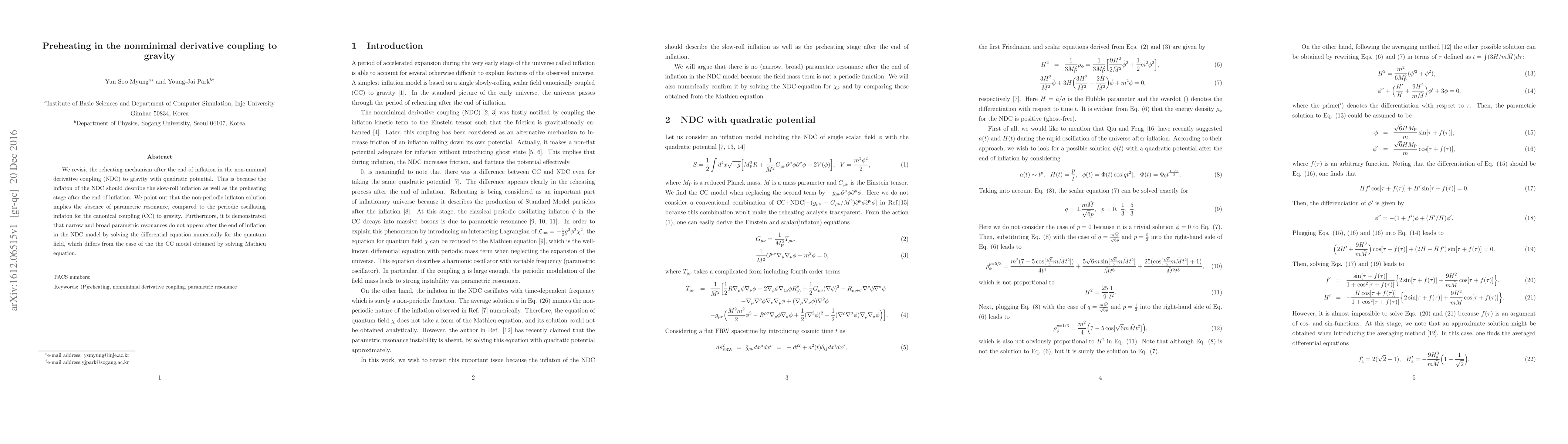 We revisit the reheating mechanism after the end of inflation in the non-minimal derivative coupling (NDC) to gravity with quadratic potential. This is because the inflaton of the NDC should describe the slow-roll inflation as well as the preheating stage after the end of inflation. We point out that the non-periodic inflaton solution implies the absence of parametric resonance, compared to the periodic oscillating inflaton for the canonical coupling (CC) to gravity. Furthermore, it is demonstrated that narrow and broad parametric resonances do not appear after the end of inflation in the NDC model by solving the differential equation numerically for the quantum field, which differs from the case of the the CC model obtained by solving Mathieu equation.