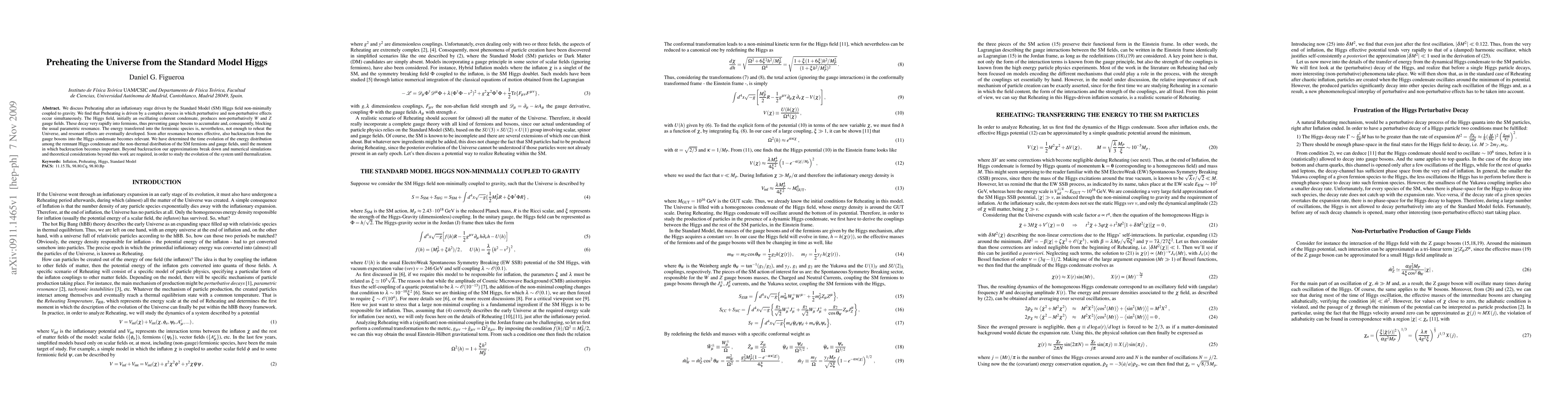 This paper investigates preheating following inflation driven by the Standard Model Higgs field, revealing a complex interplay of perturbative and non-perturbative effects. The oscillating Higgs field produces W and Z gauge fields, which decay into fermions, preventing usual parametric resonance and insufficiently reheating the universe.