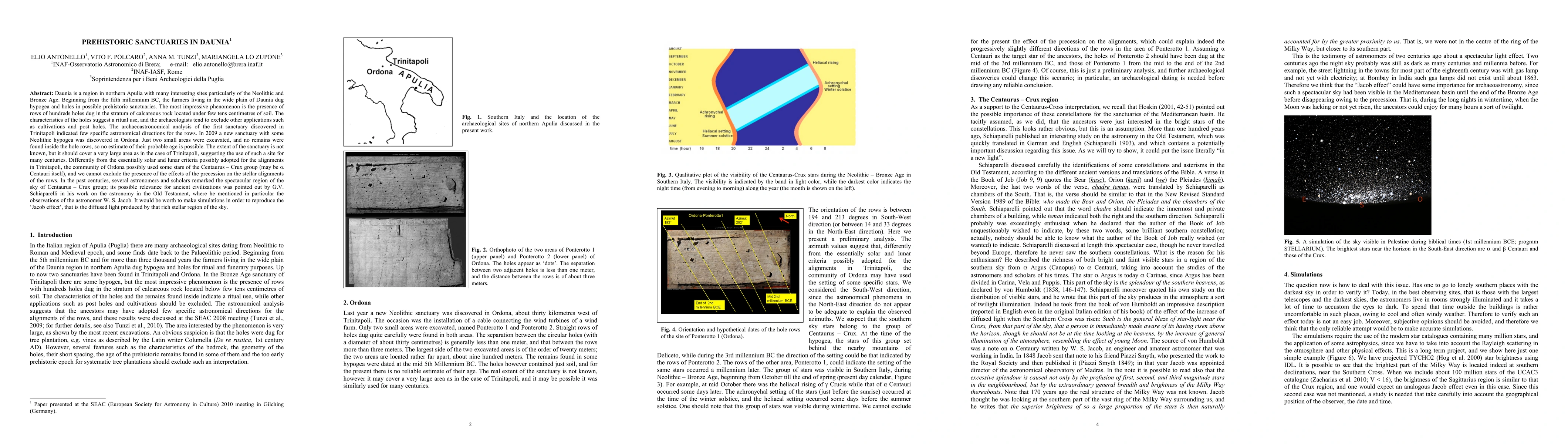 Daunia is a region in northern Apulia with many interesting archaeological sites, particularly of the Neolithic and Bronze Age. Beginning from the fifth millennium BC, the farmers living in the wide plain of Daunia dug hypogea and holes in sites that could be considered prehistoric sanctuaries. The characteristics of the rows of holes indicate a ritual use, and the archaeologists tend to exclude other applications, such as post holes and cultivations. The rows have possibly an astronomical orientation, and in the sanctuary discovered near Ordona, some stars of the Centaurus-Crux group (may be alpha Centauri itself) could have been used as targets. In past centuries, astronomers and scholars have remarked this spectacular region of the sky, and its possible relevance for the ancient civilizations was pointed out for example by G.V. Schiaparelli in 1903. In his work on the astronomy in the Old Testament, he mentioned in particular the observations of the astronomer W.S. Jacob and of other scholars. It would be probably worth to make simulations in order to reproduce the 'Jacob effect', that is the diffused light (a sort of faint twilight) produced by such very rich stellar region of the sky.