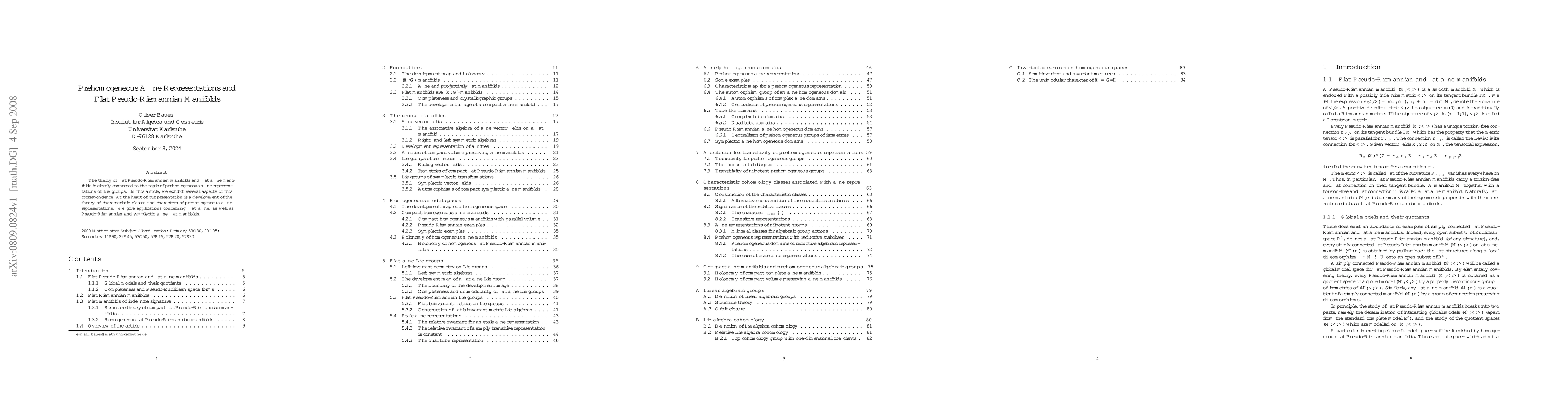 This paper explores the connection between flat Pseudo-Riemannian and affine manifolds and prehomogeneous affine representations of Lie groups, developing the theory of their characteristic classes and characters, and providing applications to various types of flat manifolds.
