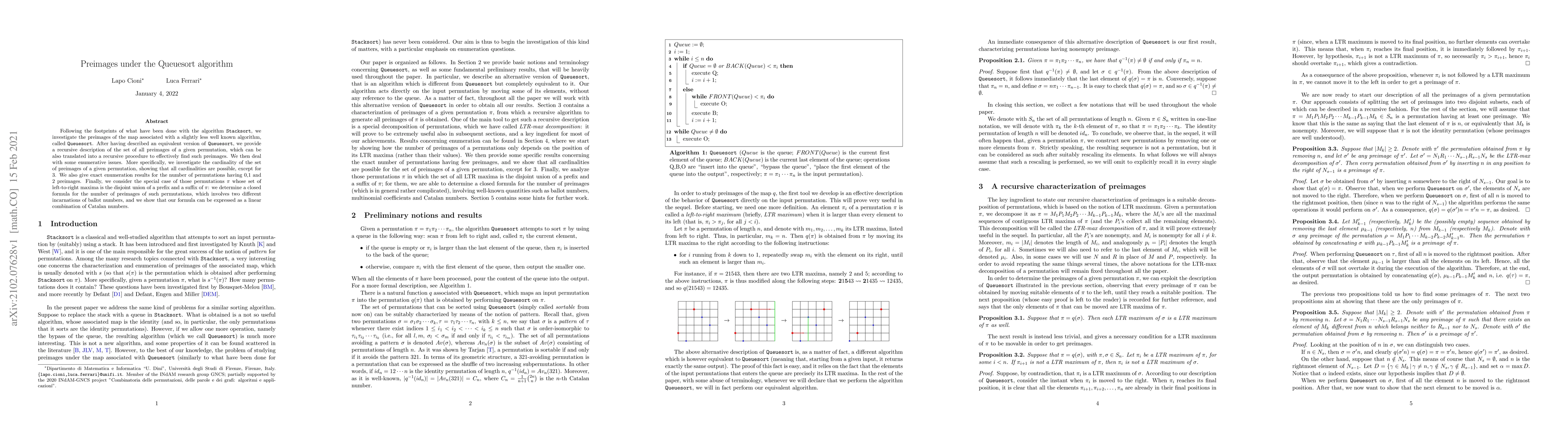 Researchers investigated preimages under Queuesort algorithm, finding that cardinalities of preimage sets are possible except for 3, and derived formulas to count permutations with specific numbers of preimages.