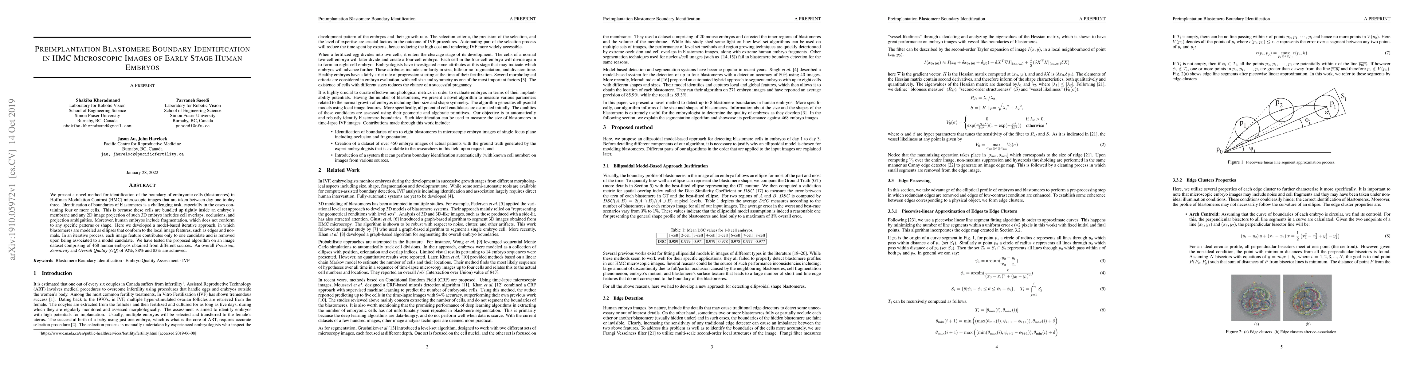 We present a novel method for identification of the boundary of embryonic cells (blastomeres) in Hoffman Modulation Contrast (HMC) microscopic images that are taken between day one to day three. Identification of boundaries of blastomeres is a challenging task, especially in the cases containing four or more cells. This is because these cells are bundled up tightly inside an embryo's membrane and any 2D image projection of such 3D embryo includes cell overlaps, occlusions, and projection ambiguities. Moreover, human embryos include fragmentation, which does not conform to any specific patterns or shape. Here we developed a model-based iterative approach, in which blastomeres are modeled as ellipses that conform to the local image features, such as edges and normals. In an iterative process, each image feature contributes only to one candidate and is removed upon being associated to a model candidate. We have tested the proposed algorithm on an image dataset comprising of 468 human embryos obtained from different sources. An overall Precision, Sensitivity and Overall Quality (OQ) of 92%, 88% and 83% are achieved.