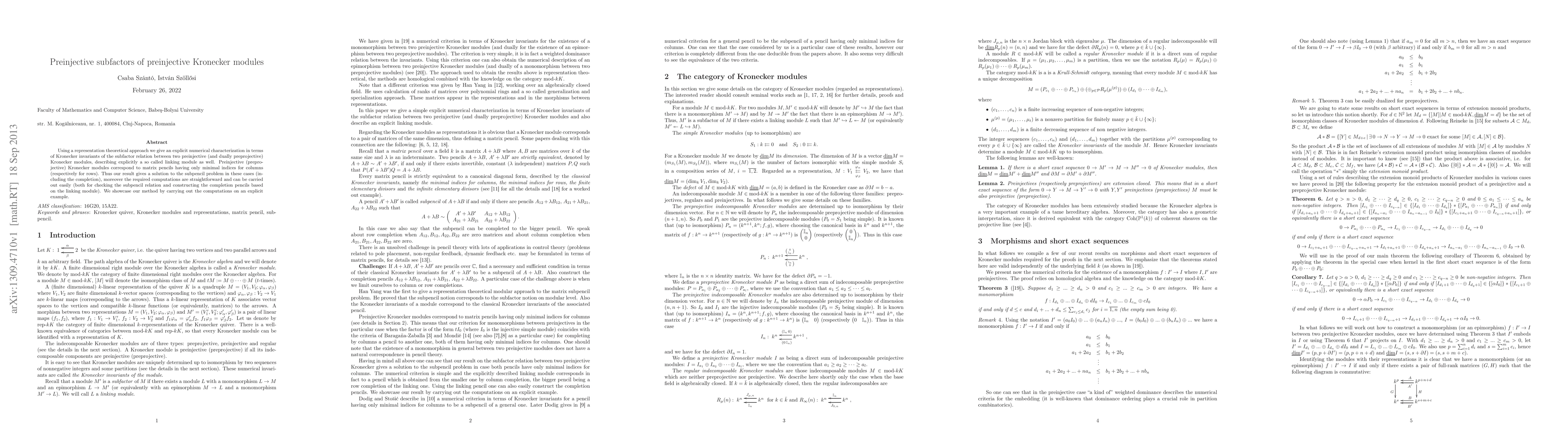 This paper provides a representation-theoretic characterization of subfactor relations between preinjective Kronecker modules using Kronecker invariants, explicitly defining a linking module and solving the subpencil problem for these modules. The method is demonstrated with a practical example.