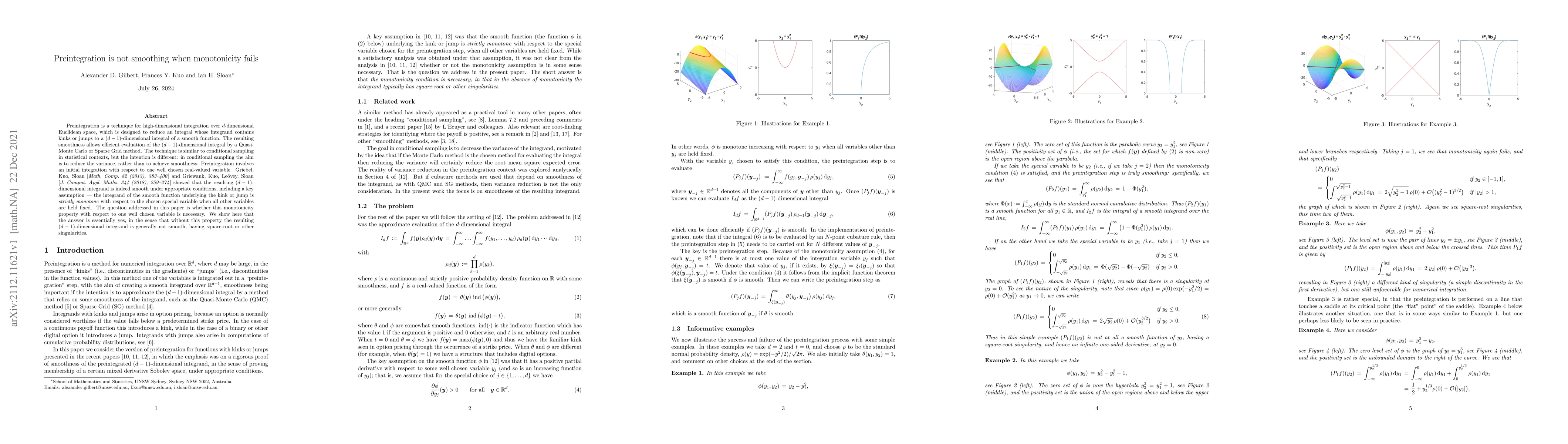 Preintegration is a technique for high-dimensional integration over $d$-dimensional Euclidean space, which is designed to reduce an integral whose integrand contains kinks or jumps to a $(d-1)$-dimensional integral of a smooth function. The resulting smoothness allows efficient evaluation of the $(d-1)$-dimensional integral by a Quasi-Monte Carlo or Sparse Grid method. The technique is similar to conditional sampling in statistical contexts, but the intention is different: in conditional sampling the aim is to reduce the variance, rather than to achieve smoothness. Preintegration involves an initial integration with respect to one well chosen real-valued variable. Griebel, Kuo, Sloan [Math. Comp. 82 (2013), 383--400] and Griewank, Kuo, Le\"ovey, Sloan [J. Comput. Appl. Maths. 344 (2018), 259--274] showed that the resulting $(d-1)$-dimensional integrand is indeed smooth under appropriate conditions, including a key assumption -- the integrand of the smooth function underlying the kink or jump is strictly monotone with respect to the chosen special variable when all other variables are held fixed. The question addressed in this paper is whether this monotonicity property with respect to one well chosen variable is necessary. We show here that the answer is essentially yes, in the sense that without this property the resulting $(d-1)$-dimensional integrand is generally not smooth, having square-root or other singularities.
