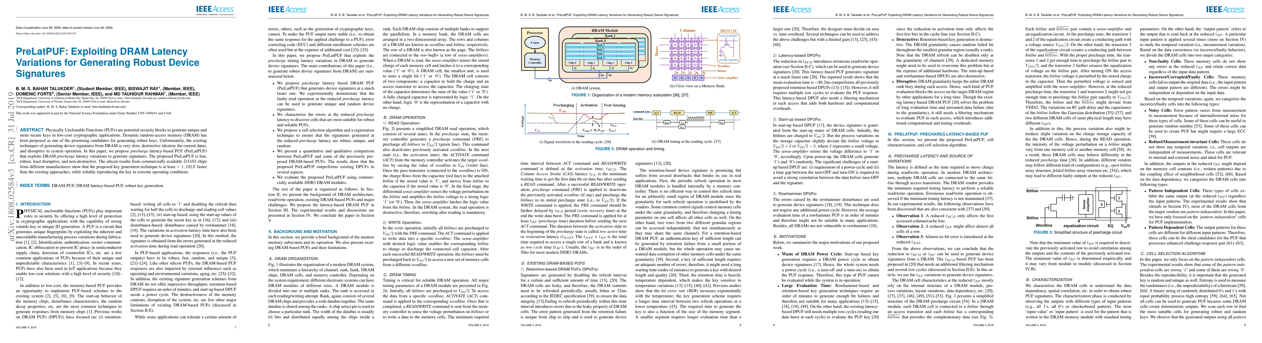 This paper introduces PreLatPUF, a novel DRAM-based PUF that leverages DRAM precharge latency variations to generate fast, robust, and non-destructive device signatures. Compared to existing methods, PreLatPUF is significantly faster and less disruptive, achieving at least 1,192X improvement in speed with reliable key reproduction across extreme conditions.