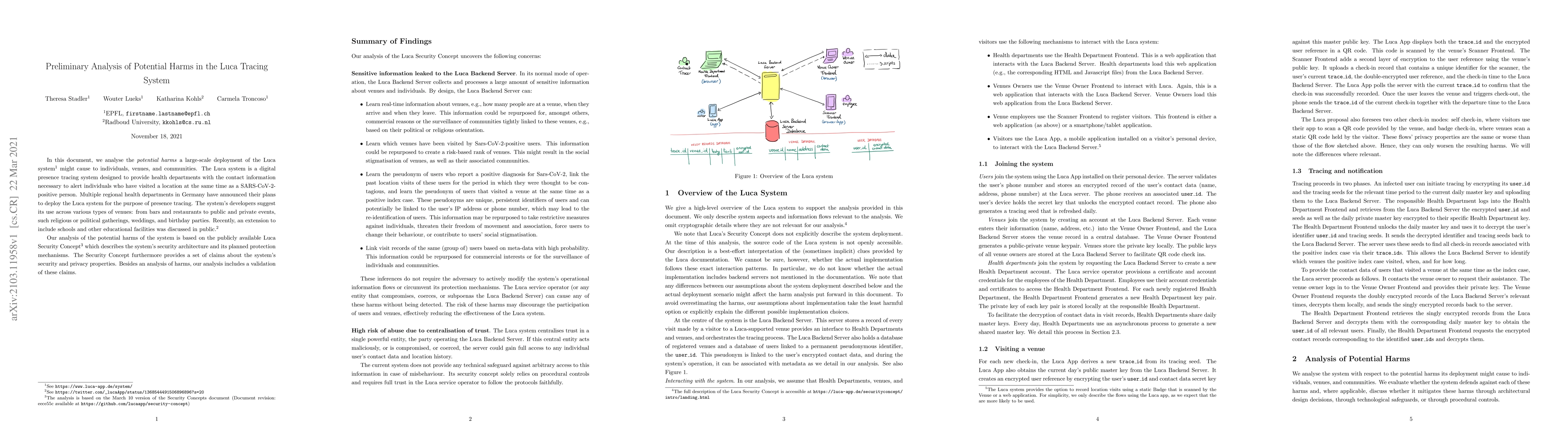 This paper analyzes potential harms of the Luca tracing system, designed for contact tracing in case of SARS-CoV-2 exposure, focusing on privacy risks to individuals, venues, and communities. It validates the system's security claims against its publicly available security concept.