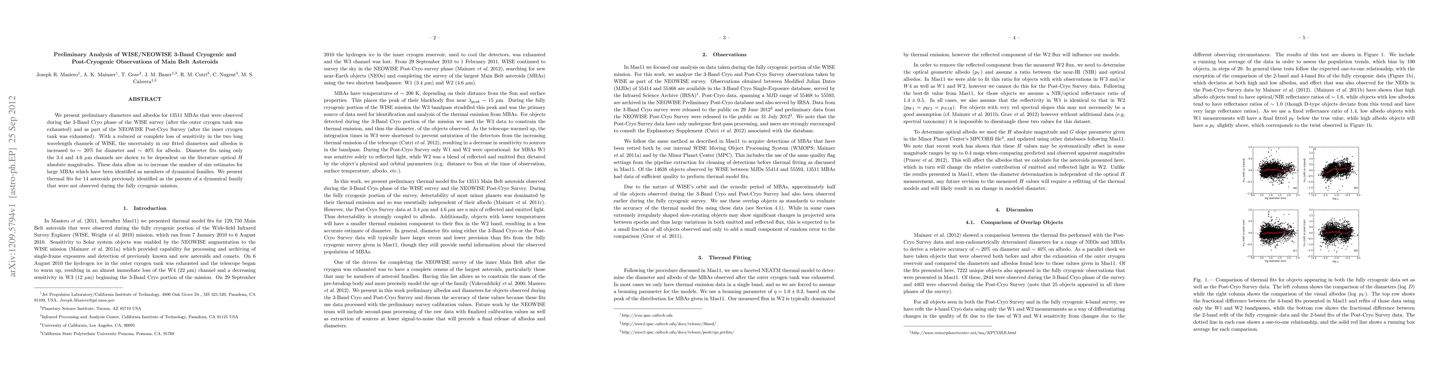 We present preliminary diameters and albedos for 13511 MBAs that were observed during the 3-Band Cryo phase of the WISE survey (after the outer cryogen tank was exhausted) and as part of the NEOWISE Post-Cryo Survey (after the inner cryogen tank was exhausted). With a reduced or complete loss of sensitivity in the two long wavelength channels of WISE, the uncertainty in our fitted diameters and albedos is increased to ~20% for diameter and ~40% for albedo. Diameter fits using only the 3.4 and 4.6 um channels are shown to be dependent on the literature optical H absolute magnitudes. These data allow us to increase the number of size estimates for large MBAs which have been identified as members of dynamical families. We present thermal fits for 14 asteroids previously identified as the parents of a dynamical family that were not observed during the fully cryogenic mission.