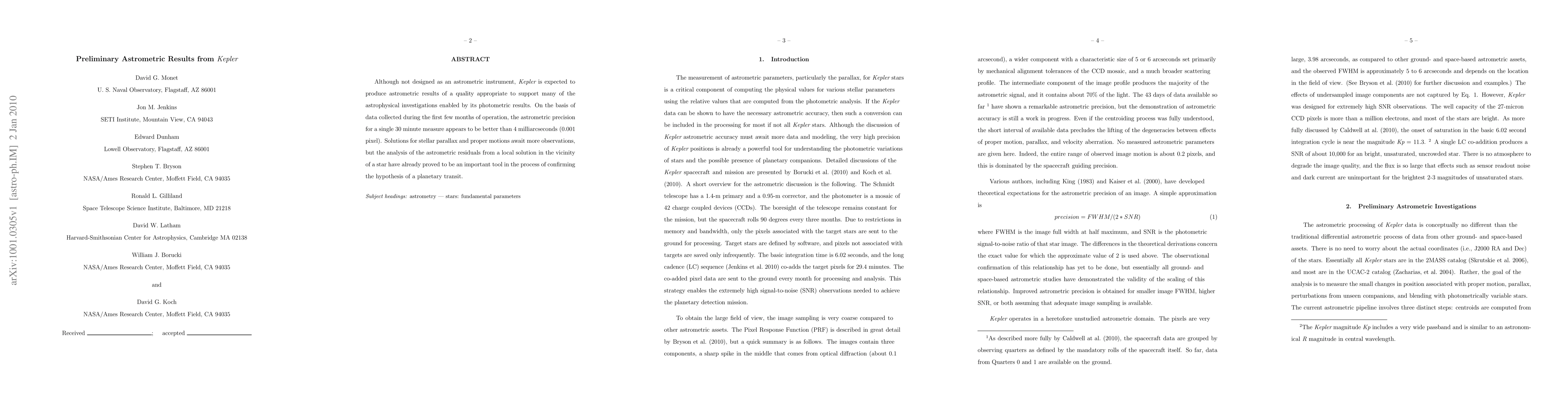 Although not designed as an astrometric instrument, Kepler is expected to produce astrometric results of a quality appropriate to support many of the astrophysical investigations enabled by its photometric results. On the basis of data collected during the first few months of operation, the astrometric precision for a single 30 minute measure appears to be better than 4 milliarcseconds (0.001 pixel). Solutions for stellar parallax and proper motions await more observations, but the analysis of the astrometric residuals from a local solution in the vicinity of a star have already proved to be an important tool in the process of confirming the hypothesis of a planetary transit.