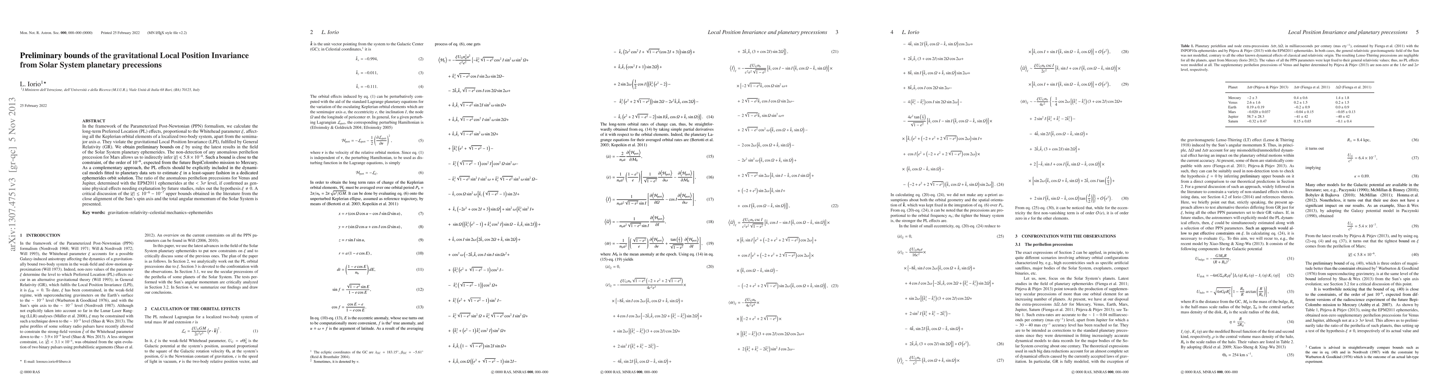 In the framework of the Parameterized Post-Newtonian (PPN) formalism, we calculate the long-term Preferred Location (PL) effects, proportional to the Whitehead parameter $\xi$, affecting all the Keplerian orbital elements of a localized two-body system, apart from the semimajor axis $a$. They violate the gravitational Local Position Invariance (LPI), fulfilled by General Relativity (GR). We obtain preliminary bounds on $\xi$ by using the latest results in the field of the Solar System planetary ephemerides. The non-detection of any anomalous perihelion precession for Mars allows us to indirectly infer $|\xi|\leq 5.8\times 10^{-6}$. \textcolor{black}{Such a bound is close to the constraint, of the order of $10^{-6}$, expected from the future BepiColombo mission to Mercury. As a complementary approach, the PL effects should be explicitly included in the dynamical models fitted to planetary data sets to estimate $\xi$ in a least-square fashion in a dedicated ephemerides orbit solution.} The ratio of the anomalous perihelion precessions for Venus and Jupiter, determined with the EPM2011 ephemerides at the $<3\sigma$ level, if confirmed as genuine physical effects needing explanation by future studies, rules out the hypothesis $\xi \neq 0$. A critical discussion of the $|\xi| \lesssim 10^{-6}-10^{-7}$ upper bounds obtained in the literature from the close alignment of the Sun's spin axis and the total angular momentum of the Solar System is presented.