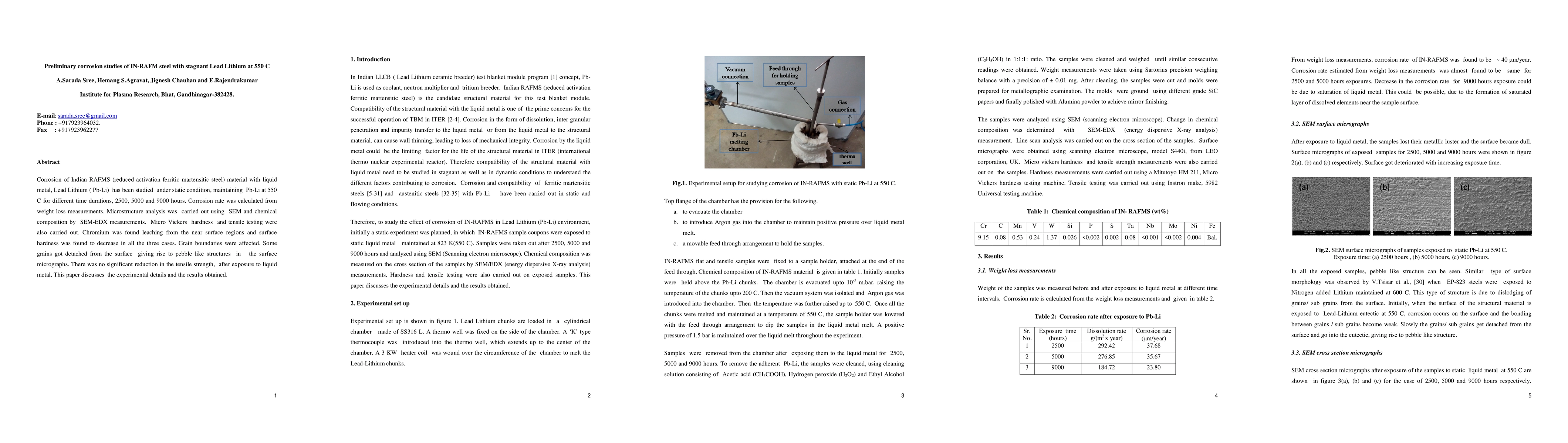 Corrosion of IN-RAFM steel exposed to stagnant Lead-Lithium at 550 C showed significant chromium leaching, decreased surface hardness, and grain boundary detachment. Tensile strength remained unaffected by the exposure.
