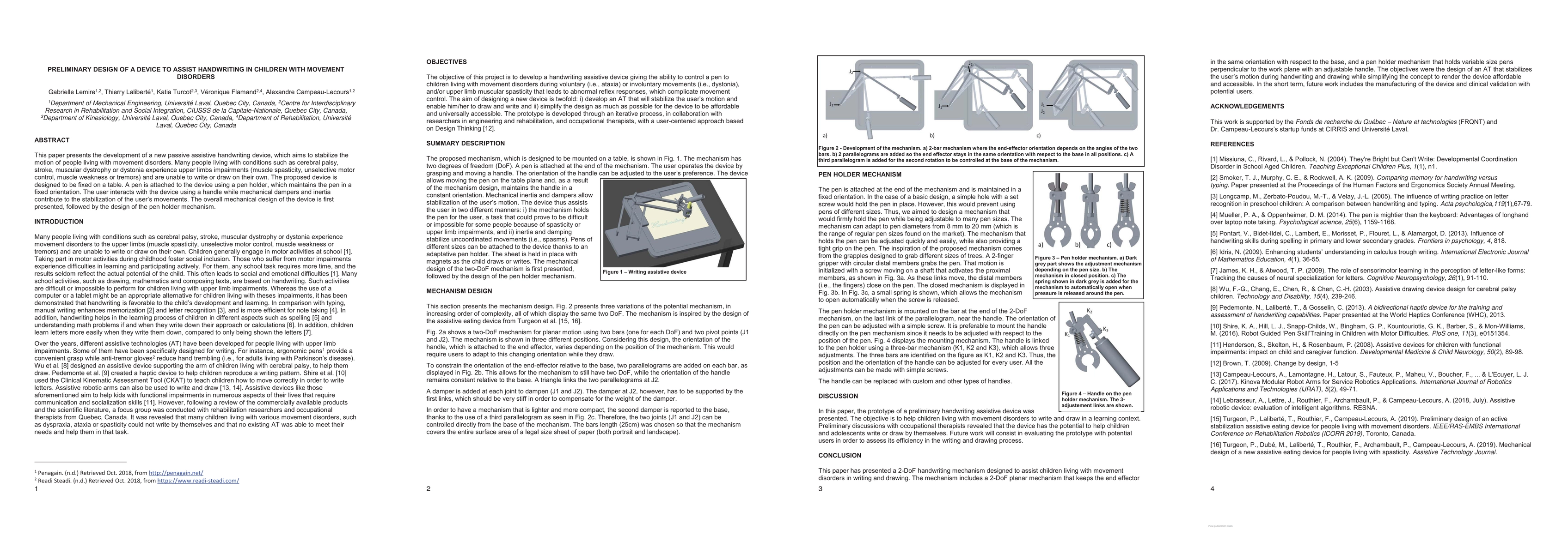 A new passive assistive handwriting device is designed to stabilize motion for children with movement disorders, improving their ability to write and draw. The device, which can be fixed on a table, uses mechanical dampers and inertia to stabilize user movements.
