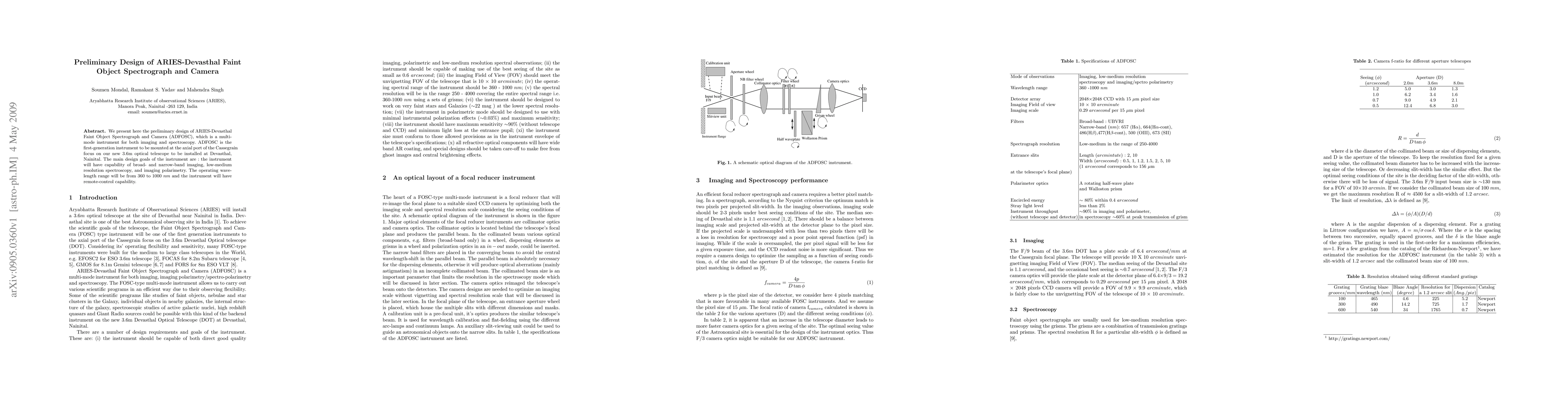The ARIES-Devasthal Faint Object Spectrograph and Camera (ADFOSC) is a multi-mode instrument designed for both imaging and spectroscopy, with capabilities for broad- and narrow-band imaging, low-medium resolution spectroscopy, and imaging polarimetry, operating in the wavelength range of 360 to 1000 nm. It will be the first-generation instrument for the new 3.6m optical telescope at Devasthal, Nainital, with remote-control functionality.