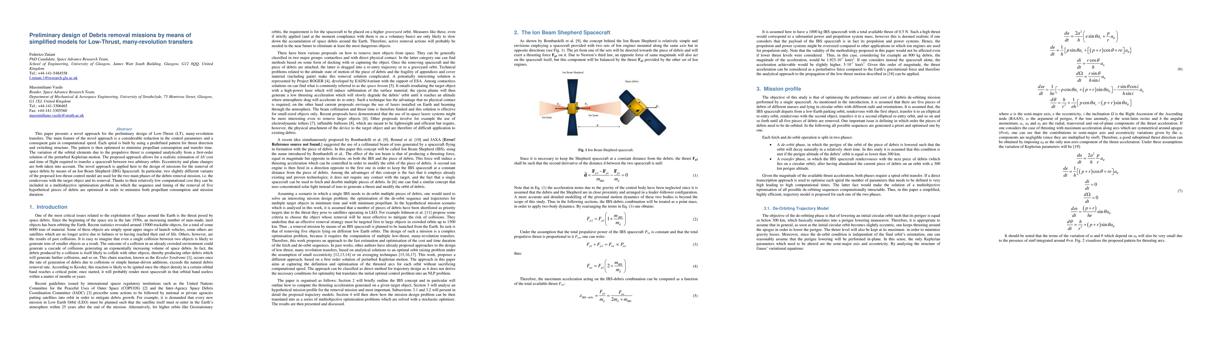 This paper presents a novel approach for the preliminary design of Low-Thrust, many-revolution transfers. The main feature of the novel approach is a considerable reduction in the control parameters and a consequent gain in computational speed. Each spiral is built by using a predefined pattern for thrust direction and switching structure. The pattern is then optimised to minimise propellant consumption and transfer time. The variation of the orbital elements due to the thrust is computed analytically from a first-order solution of the perturbed Keplerian motion. The proposed approach allows for a realistic estimation of {\Delta}V and time of flight required to transfer a spacecraft between two arbitrary orbits. Eccentricity and plane changes are both accounted for. The novel approach is applied here to the design of missions for the removal of space debris by means of an Ion Beam Shepherd Spacecraft. In particular, two slightly different variants of the proposed low-thrust control model are used for the different phases of the mission. Thanks to their low computational cost they can be included in a multiobjective optimisation problem in which the sequence and timing of the removal of five pieces of debris are optimised to minimise propellant consumption and mission duration.
