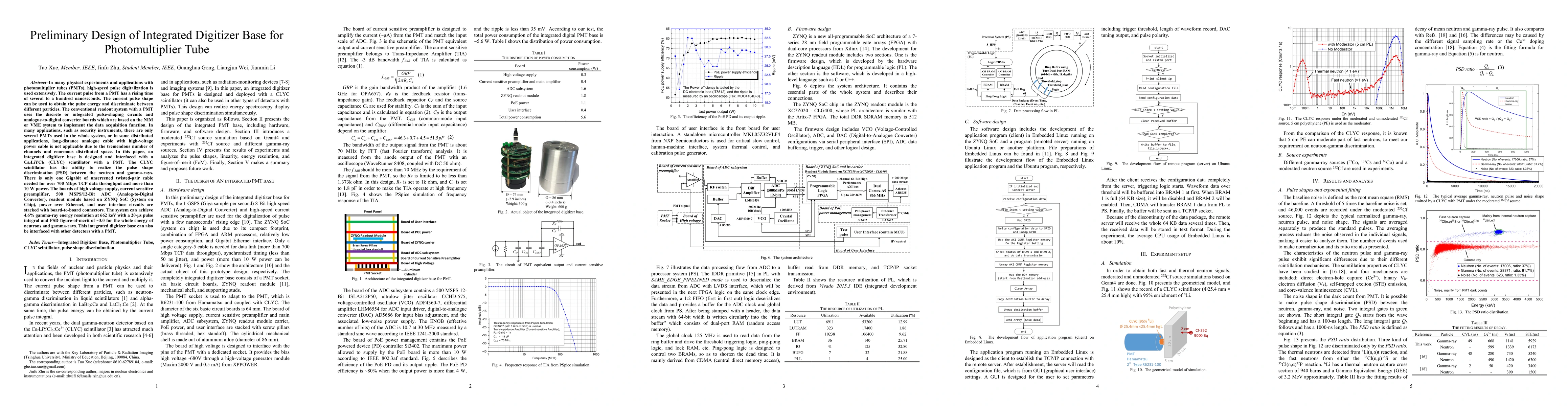 In many physical experiments and applications with photomultiplier tubes (PMTs), high-speed pulse digitalization is used extensively. The current pulse from a PMT has a rising time of several to a hundred nanoseconds. The current pulse shape can be used to obtain the pulse energy and discriminate between different particles. The conventional readout system with a PMT uses the discrete or integrated pulse-shaping circuits and analogue-to-digital converter boards which are based on the NIM or VME system to implement the data acquisition function. In many applications, such as security instruments, there are only several PMTs used in the whole system, or in some distributed applications, long-distance analogue cable with high-voltage power cable is not applicable due to the tremendous number of channels and enormous distributed space. In this paper, an integrated digitizer base is designed and interfaced with a Cs2LiYCl6 (CLYC) scintillator with a PMT. The CLYC scintillator has the ability to realize the pulse shape discrimination (PSD) between the neutron and gamma-rays. There is only one Gigabit of unscreened twisted-pair cable needed for over 700 Mbps TCP data throughput and more than 10 W power. The boards of high voltage supply, current sensitive preamplifier, 500 MSPS/12-Bit ADC (Analog-to-Digital Converter), readout module based on ZYNQ SoC (System on Chip), power over Ethernet, and user interface circuits are stacked with board-to-board connectors. The system can achieve 4.6% gamma-ray energy resolution at 662 keV with a 20-{\mu}s pulse integral and PSD figure-of-merit of ~3.0 for the whole energy of neutrons and gamma-rays. This integrated digitizer base can also be interfaced with other detectors with a PMT.