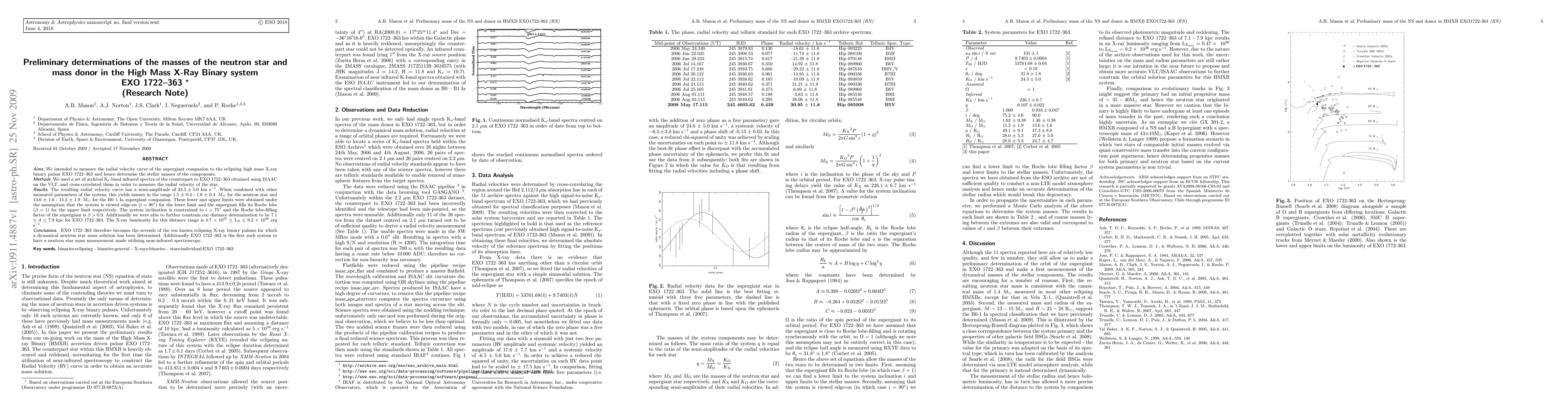 We intended to measure the radial velocity curve of the supergiant companion to the eclipsing high mass X-ray binary pulsar EXO1722-363 and hence determine the stellar masses of the components. We used a set of archival K$_{\rm s}$-band infrared spectra of the counterpart to EXO1722-363 obtained using ISAAC on the VLT, and cross-correlated them in order to measure the radial velocity of the star. The resulting radial velocity curve has a semi-amplitude of $24.5 \pm 5.0$ km s$^{-1}$. When combined with other measured parameters of the system, this yields masses in the range 1.5 $\pm$ 0.4 - 1.6 $\pm$ 0.4 M$_{\odot}$ for the neutron star and 13.6 $\pm$ 1.6 - 15.2 $\pm$ 1.9 M$_{\odot}$ for the B0--1 Ia supergiant companion. These lower and upper limits were obtained under the assumption that the system is viewed edge-on (i = 90$^\circ$) for the lower limit and the supergiant fills its Roche lobe ($\beta = 1$) for the upper limit respectively. The system inclination is constrained to $i>75^{\circ}$ and the Roche lobe-filling factor of the supergiant is $\beta>0.9$. Additionally we were able to further constrain our distance determination to be 7.1 $\le$ d $\le$ 7.9 kpc for EXO1722-363. The X-ray luminosity for this distance range is 4.7 $\times$ 10$^{35}$ $\le$ L$_{\rm X}$ $\le$ 9.2 $\times$ 10$^{36}$ erg s$^{-1}$. EXO1722-363 therefore becomes the seventh of the ten known eclipsing X-ray binary pulsars for which a dynamical neutron star mass solution has been determined. Additionally EXO1722-363 is the first such system to have a neutron star mass measurement made utilising near-infrared spectroscopy.