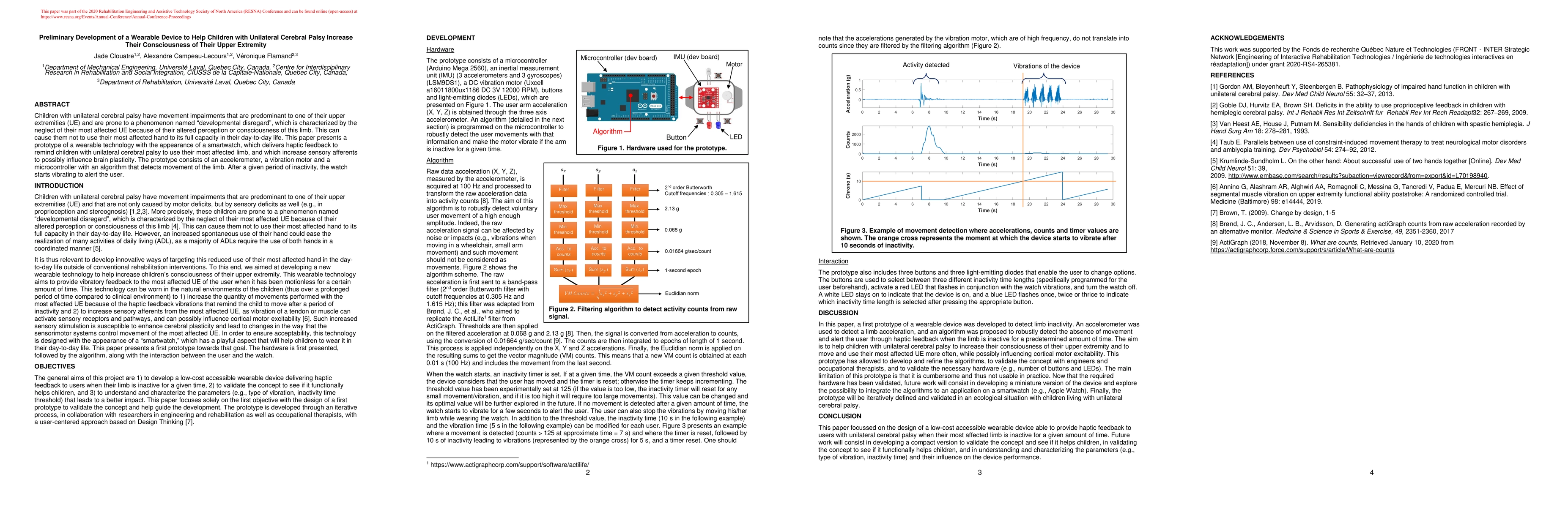 Children with unilateral cerebral palsy have movement impairments that are predominant to one of their upper extremities (UE) and are prone to a phenomenon named "developmental disregard", which is characterized by the neglect of their most affected UE because of their altered perception or consciousness of this limb. This can cause them not to use their most affected hand to its full capacity in their day-to-day life. This paper presents a prototype of a wearable technology with the appearance of a smartwatch, which delivers haptic feedback to remind children with unilateral cerebral palsy to use their most affected limb, and which increase sensory afferents to possibly influence brain plasticity. The prototype consists of an accelerometer, a vibration motor and a microcontroller with an algorithm that detects movement of the limb. After a given period of inactivity, the watch starts vibrating to alert the user.