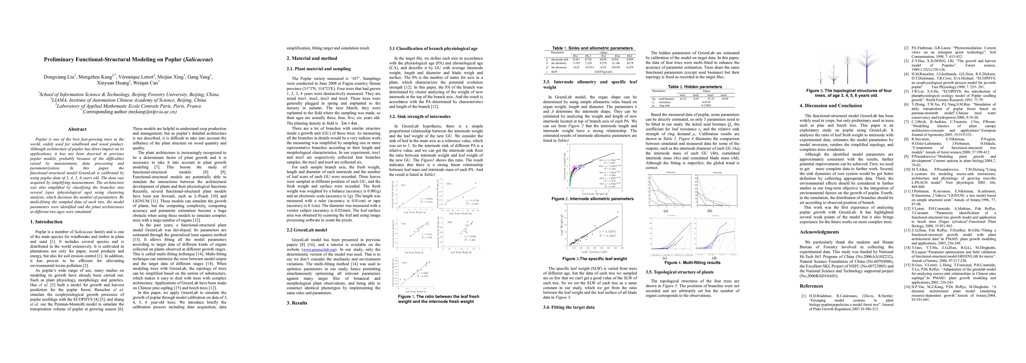 Poplar is one of the best fast-growing trees in the world, widely used for windbreak and wood product. Although architecture of poplar has direct impact on its applications, it has not been descried in previous poplar models, probably because of the difficulties raised by measurement, data processing and parameterization. In this paper, the functional-structural model GreenLab is calibrated by using poplar data of 3, 4, 5, 6 years old. The data was acquired by simplifying measurement. The architecture was also simplified by classifying the branches into several types (physiological age) using clustering analysis, which decrease the number of parameters. By multi-fitting the sampled data of each tree, the model parameters were identified and the plant architectures at different tree ages were simulated.