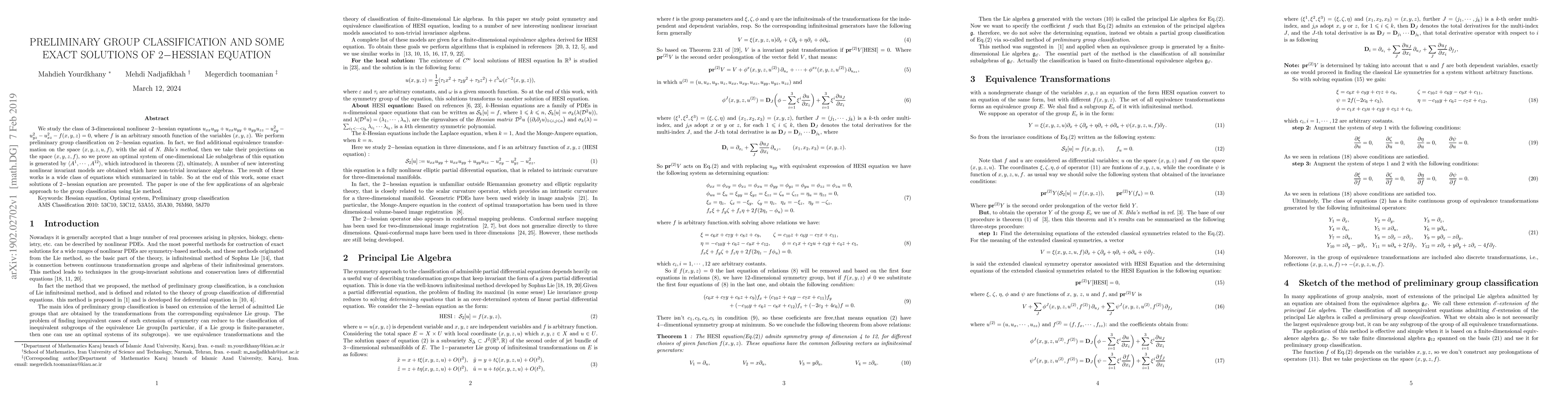 We study the class of 3-dimensional nonlinear 2-hessian equations mentioned in the text. We perform preliminary group classification on 2-hessian equation. In fact, we find additional equivalence transformation on the space (x,y,z,u,f), with the aid of a method, then we take their projections on the space (x,y,z,f), so we prove an optimal system of one-dimensional Lie sub algebras of this equation is generated by A1 to A12, which introduced in theorem 2, ultimately, A number of new interesting nonlinear invariant models are obtained which have non-trivial in variance algebras. The result of these works is a wide class of equations which summarized in table. So at the end of this work, some exact solutions of 2-hessian equation are presented. The paper is one of the few applications of an algebraic approach to the group classification using Lie method.