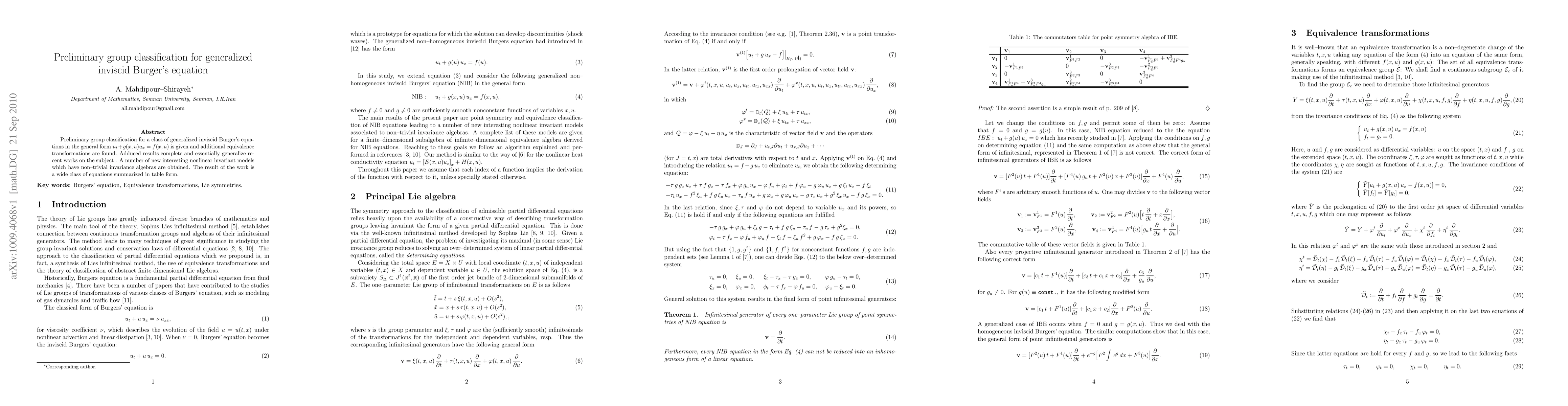 This paper presents a preliminary group classification of generalized inviscid Burger's equations, identifying new equivalence transformations and nonlinear invariant models with non-trivial invariance algebras. The findings generalize recent work and summarize the results in a comprehensive table.