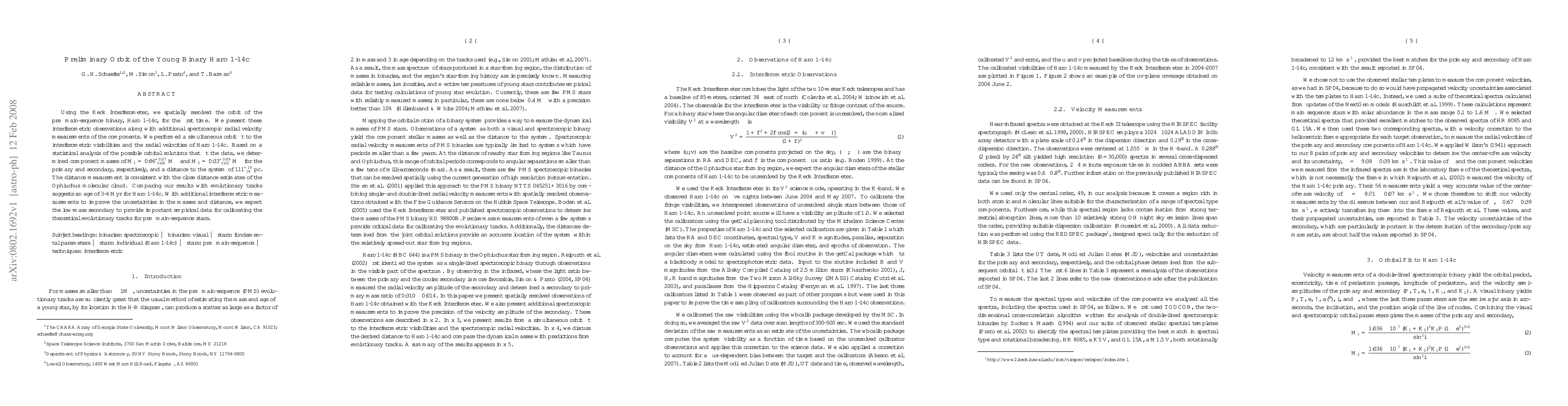 Using the Keck Interferometer, we spatially resolved the orbit of the pre-main sequence binary, Haro 1-14c, for the first time. We present these interferometric observations along with additional spectroscopic radial velocity measurements of the components. We performed a simultaneous orbit fit to the interferometric visibilities and the radial velocities of Haro 1-14c. Based on a statistical analysis of the possible orbital solutions that fit the data, we determined component masses of M_1 = 0.96 (+0.27/-0.08) Msun and M_2 = 0.33 (+0.09/-0.02) Msun for the primary and secondary, respectively, and a distance to the system of 111 (+19/-18) pc. The distance measurement is consistent with the close distance estimates of the Ophiuchus molecular cloud. Comparing our results with evolutionary tracks suggests an age of 3-4 Myr for Haro 1-14c. With additional interferometric measurements to improve the uncertainties in the masses and distance, we expect the low-mass secondary to provide important empirical data for calibrating the theoretical evolutionary tracks for pre-main sequence stars.