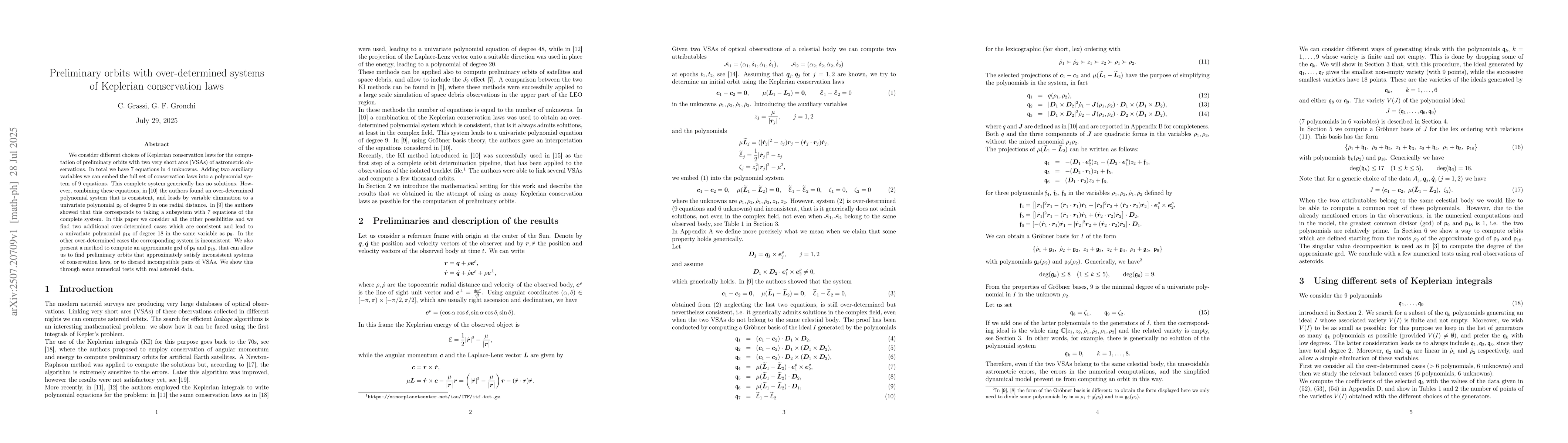 We consider different choices of Keplerian conservation laws for the computation of preliminary orbits with two very short arcs (VSAs) of astrometric observations. In total we have 7 equations in 4 unknowns. Adding two auxiliary variables we can embed the full set of conservation laws into a polynomial system of 9 equations. This complete system generically has no solutions. However, combining these equations, in [10] the authors found an over-determined polynomial system that is consistent, and leads by variable elimination to a univariate polynomial $\mathsf{p}_9$ of degree 9 in one radial distance. In [9] the authors showed that this corresponds to taking a subsystem with 7 equations of the complete system. In this paper we consider all the other possibilities and we find two additional over-determined cases which are consistent and lead to a univariate polynomial $\mathsf{p}_{18}$ of degree 18 in the same variable as $\mathsf{p}_9$. In the other over-determined cases the corresponding system is inconsistent. We also present a method to compute an approximate gcd of $\mathsf{p}_9$ and $\mathsf{p}_{18}$, that can allow us to find preliminary orbits that approximately satisfy inconsistent systems of conservation laws, or to discard incompatible pairs of VSAs. We show this through some numerical tests with real asteroid data.